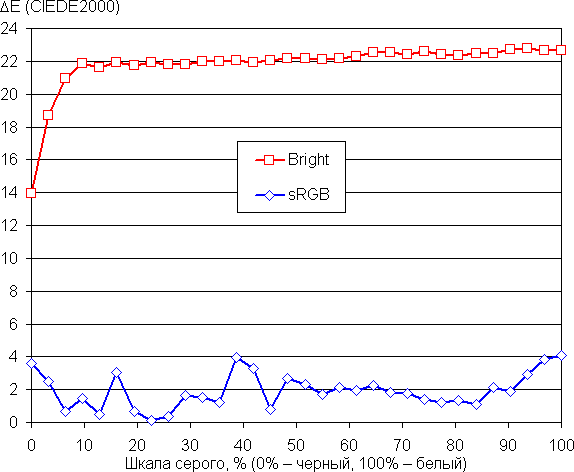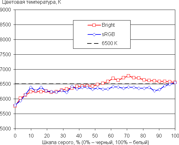 Графики ниже показывают цветовую температуру на различных участках шкалы серого и отклонение от спектра абсолютно черного тела (параметр ΔE) для самого яркого режима (Bright) и для сбалансированного (профиль sRGB, BrilliantColor = 1). Укажем, что близкий к черному диапазон можно не учитывать, так как в нем цветопередача не так важна, а погрешность измерения цветовых характеристик высокая.