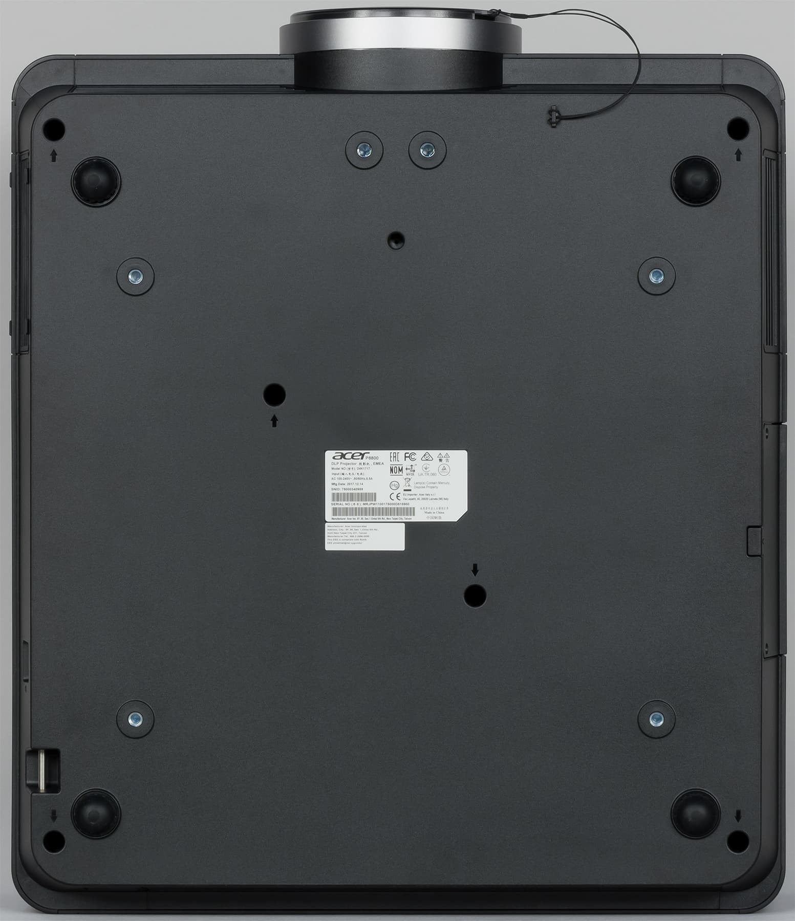 Проектор оснащен четырьмя вывинчивающимися из корпуса ножками (примерно на 28 мм, стальная стойка и стальная втулка с резьбой, закругленные подошвы из резины), позволяющими устранить небольшой перекос при размещении проектора на горизонтальной поверхности. Для крепления к потолочному кронштейну в днище проектора вделаны 4 стальные втулки с резьбой М8. Еще две пары резьбовых отверстий предназначены, видимо, для крепления опциональных аксессуаров — внешнего анаморфотного объектива-насадки или фильтра.
