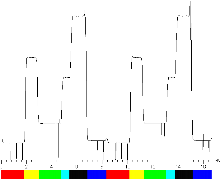 Проектор оснащен светофильтром с шестью сегментами: широкие красный, зеленый и синий, чуть уже прозрачный и желтый и узкий голубой (cyan). За счет желтого, голубого и прозрачного сегментов и использования промежутков между сегментами в ярких режимах повышается яркость белого поля. Также указанные сегменты участвуют в формировании соответствующих им и ряда других цветов. На графике ниже приведена зависимость яркости (вертикальная ось) от времени (горизонтальная ось) при выводе белого поля (профиль Bright). Цветные прямоугольники под шкалой показывают периоды прохождения сегментов соответствующих цветов.