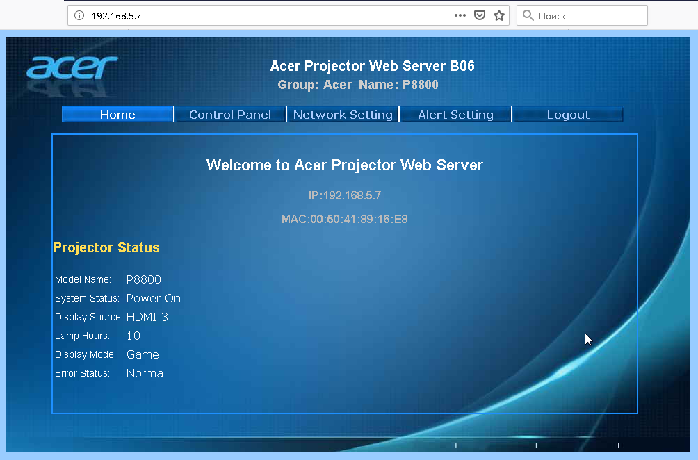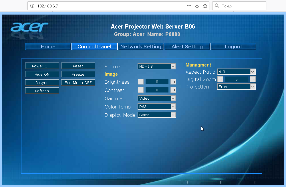 Разъем USB Type A используется, по всей видимости, в сервисных целях и для питания внешних устройств, например, Wi-Fi-адаптеров, подключаемых к HDMI. Для удаленного контроля и управления можно использовать интерфейсы RS-232C (на CD-ROM есть таблица с командами) и Ethernet. Заявлена поддержка Crestron (eControl), есть и встроенный в проектор веб-сервер с виртуальной панелью управления.