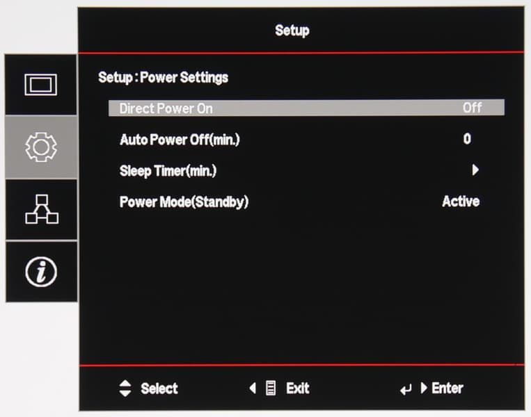 Есть функция автоматического включения при подаче энергии, таймер на выключение при отсутствии сигнала, безусловный таймер на выключение, защита паролем в том числе с отложенным по времени работы запросом пароля, блокировка кнопок на корпусе проектора.