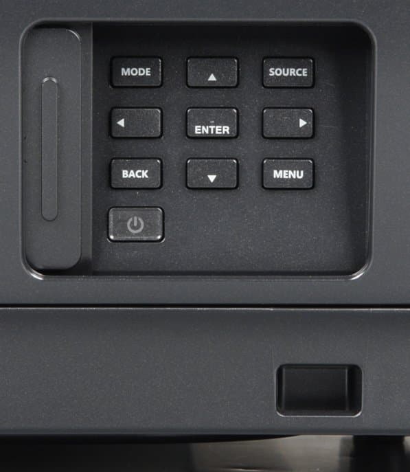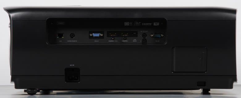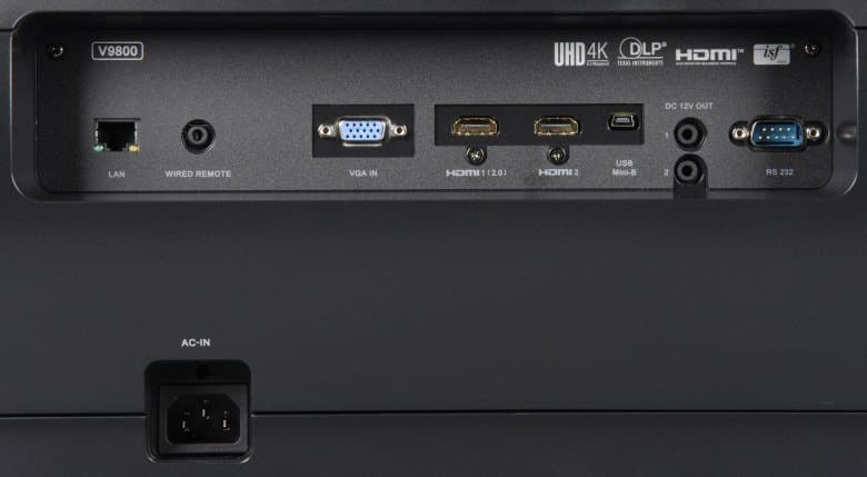 Проектор оснащен двумя HDMI-входами и единственным аналоговым видеовходом — VGA. Входы HDMI неравнозначные, HDMI 1 имеет версию 2.0 и поддерживает HDCP 2.2. С практической точки зрения это означает, что именно он поддерживает не просто видеосигнал с разрешением 4К, но и с максимально возможной цветовой четкостью при частоте 60 кадр/с. Переключение между источниками осуществляется с помощью кнопки Source на корпусе проектора или на пульте (при этом на экран выводится список входов, в котором выбирается нужный вход) или тремя кнопками прямого выбора на пульте. Есть отключаемая функция автоматического поиска активного входа. Заявлено, что проектор может взаимодействовать по протоколу CEC с подключенным по HDMI оборудованием, при этом должно поддерживаться синхронное включение и выключение. Цепь управления экрана с электромеханическим приводом можно подключить к выходам с названием DC 12V Out.