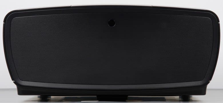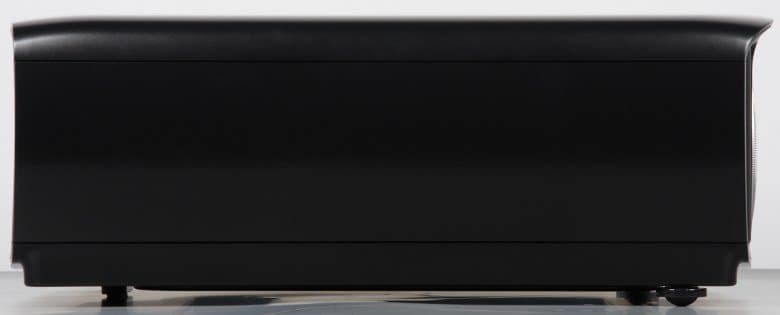 Внешние панели корпуса проектора изготовлены в основном из пластика с черным полуматовым покрытием с мелкими серебристыми вкраплениями. Фронтальная панель — из черного пластика без покрытия с матовой или зеркально гладкой поверхностью, задняя панель — из черного пластика с матовой поверхностью и с мелким рельефным узором. Ниша объектива и кольца на нем — из пластика с матовым серебристым покрытием. Дизайн симметричный — ось объектива совмещена с продольной осью корпуса проектора, — что приятно с эстетической точки зрения и несколько облегчает установку проектора. На правом боку ничего нет.