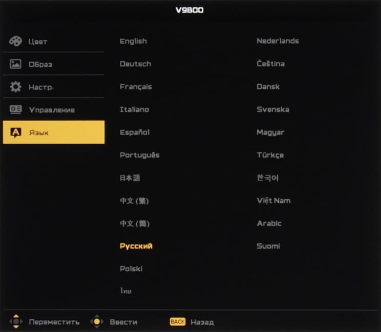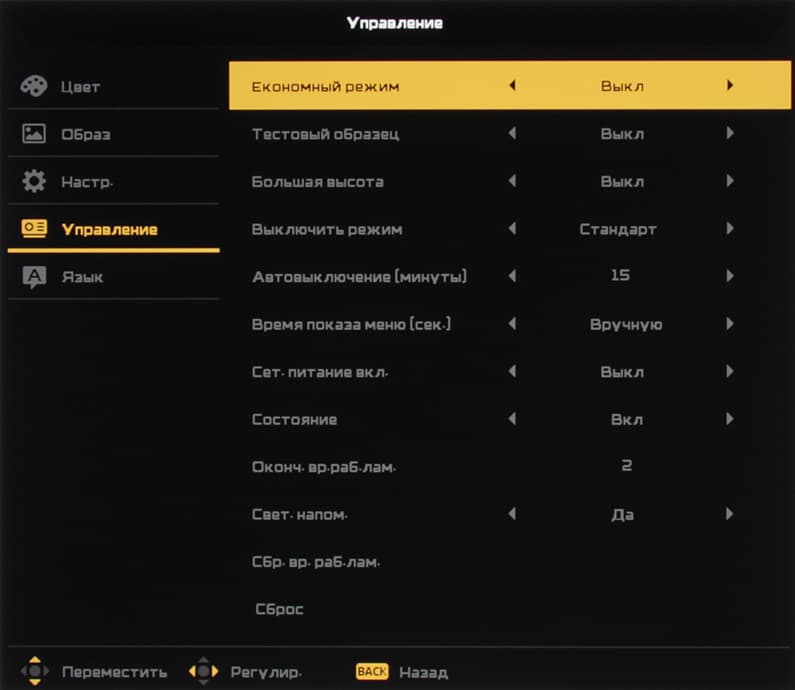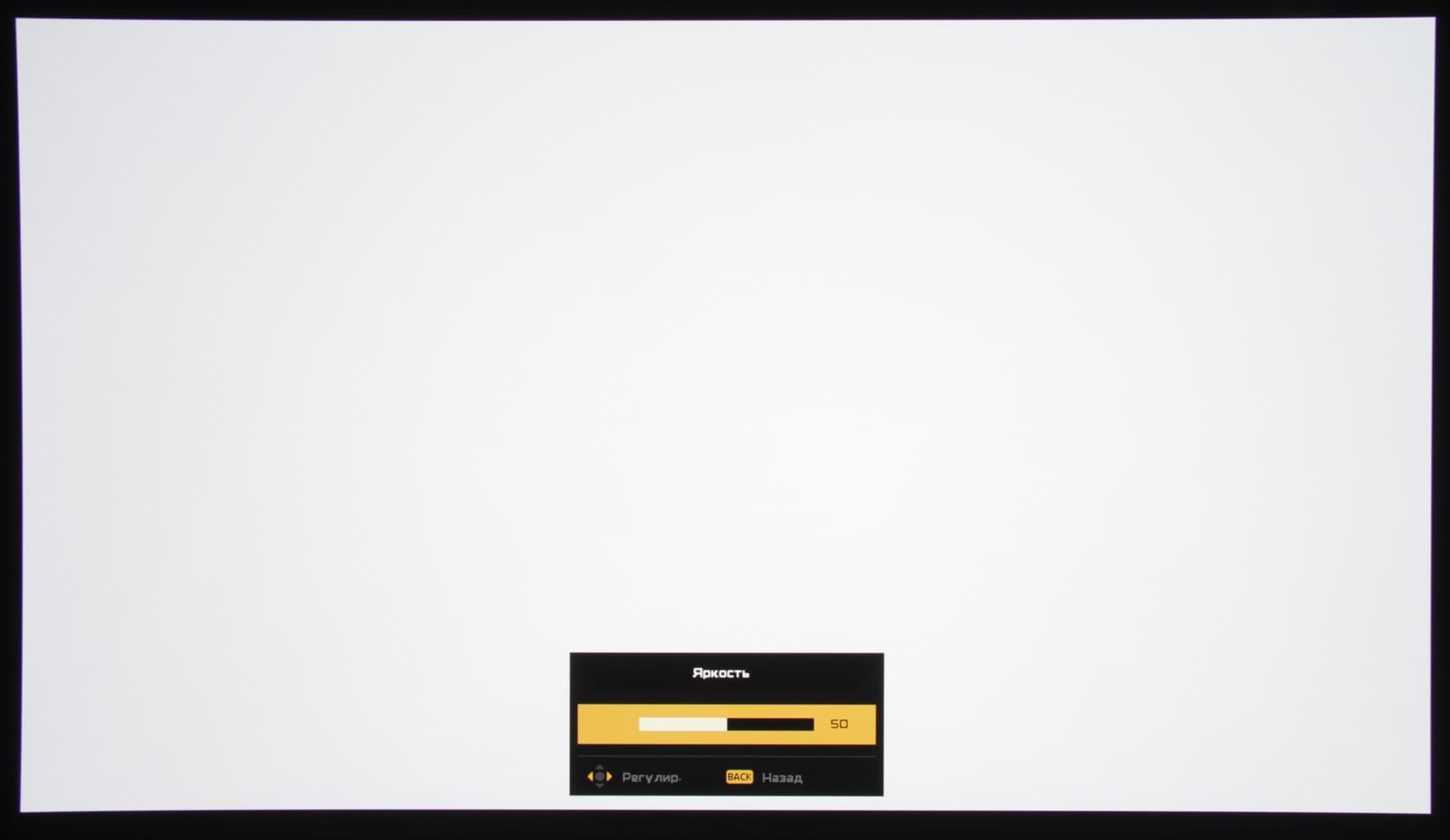 Меню строгое, оно имеет преимущественно черно-серо-желтое оформление. Шрифт меню мелковат и он слишком плотный, к тому же надписи неконтрастные, серые, в итоге читаемость меню невысокая. Настроек много. Навигация удобная. Самая нижняя строчка содержит подсказку по функциям кнопок. При настройке некоторых параметров, влияющих на изображение, на экран выводится минимум информации — только название настройки, ползунок и текущее значение, что облегчает оценку вносимых изменений картинки (белый прямоугольник ниже — это вся область вывода изображения).