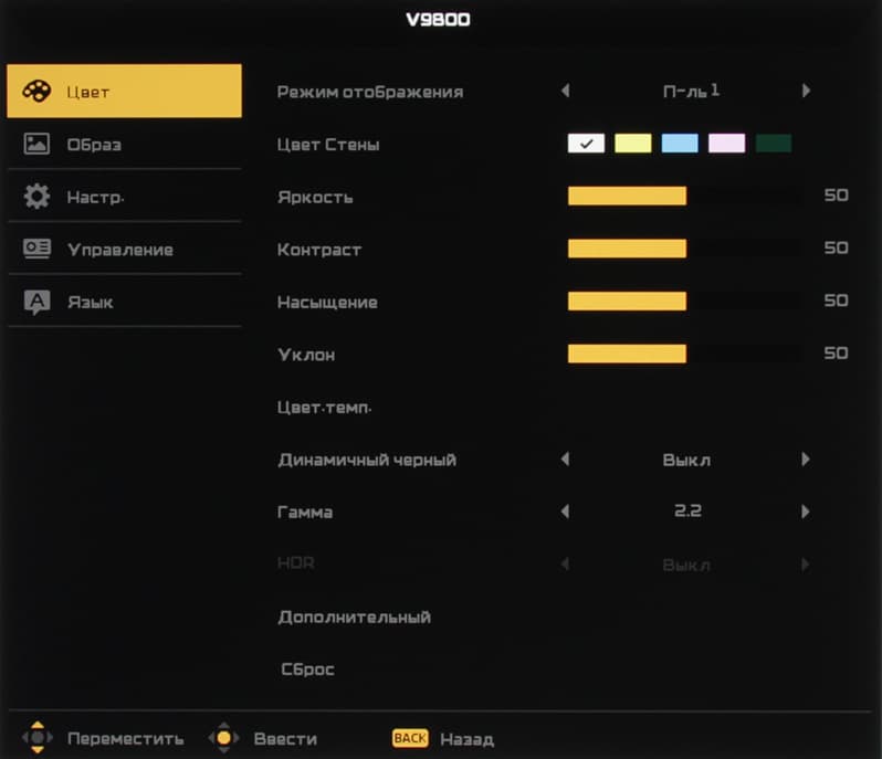 Воротки тугие, вращать их получается только медленно, удерживая двумя пальцами. Для облегчения настройки проекции можно кнопкой Pattern пульта или из меню вывести на экран тестовый шаблон.