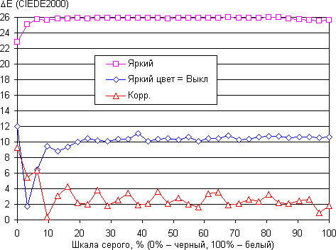 Дисбаланс оттенков в случае самого яркого режима очень существенный. Отключение Brilliant Color с потребительской точки зрения уже обеспечивает хорошее качество цветопередачи, так как цветовая температура близка к стандартным 6500 К абсолютно черного тела, а ΔE порядка 10 единиц, при этом оба параметра не очень сильно изменяются от оттенка к оттенку — это положительно сказывается на визуальной оценке цветового баланса. Коррекция баланса приблизила цветовую температуру к 6500 К и снизила ΔE. Однако по какой-то причине удобная коррекция цветового баланса настройками усиления трех основных цветов недоступна при полном отключении Brilliant Color, то есть в этом случае белый цвет слегка ярче, чем нужно. Разумеется, чем точнее настроена цветопередача, тем ниже яркость и контраст. Тут уж придется выбирать, что важнее.
