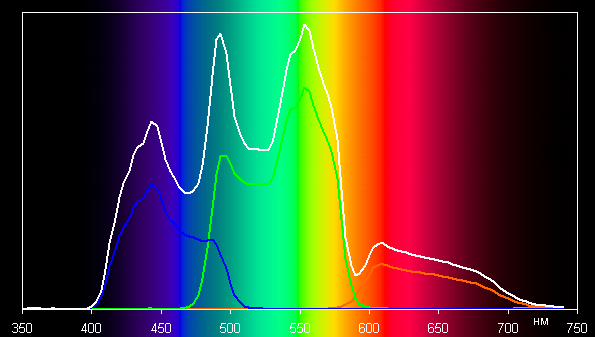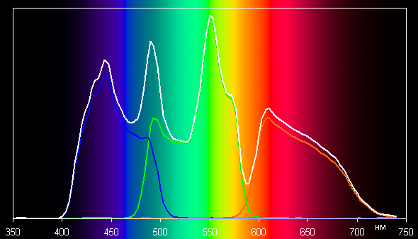 Цвета имеют естественную насыщенность (напомним, что практически весь потребительский цифровой контент рассчитан на демонстрацию на устройствах с охватом sRGB). Ниже приведены спектры белого поля (белая линия), наложенные на спектры красного, зеленого и синего полей (линии соответствующих цветов) при включенном Яркий цвет (Brilliant Color) с выбором самого яркого встроенного профиля Яркий: