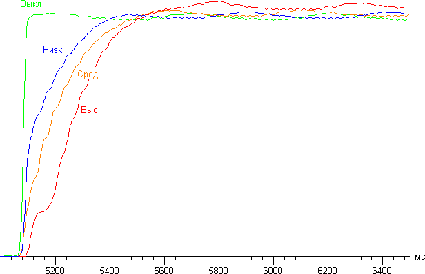 Ниже приведен график зависимости яркости от времени при переключении с вывода черного поля на вывод белого поля после 5-секундного периода вывода черного поля для случая, когда режим с динамическим управлением диафрагмы выключен и для трех вариантов его работы: