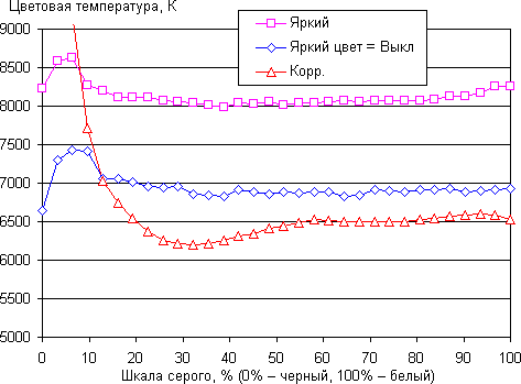 Графики ниже показывают цветовую температуру на различных участках шкалы серого и отклонение от спектра абсолютно черного тела (параметр ΔE) для самого яркого режима (при включенном Brilliant Color), после отключения Brilliant Color и после небольшой коррекции цветового баланса настройками усиления трех основных цветов при включенном Brilliant Color, но минимальном значении Пик белого. Укажем, что близкий к черному диапазон можно не учитывать, так как в нем цветопередача не так важна, а погрешность измерения цветовых характеристик высокая.