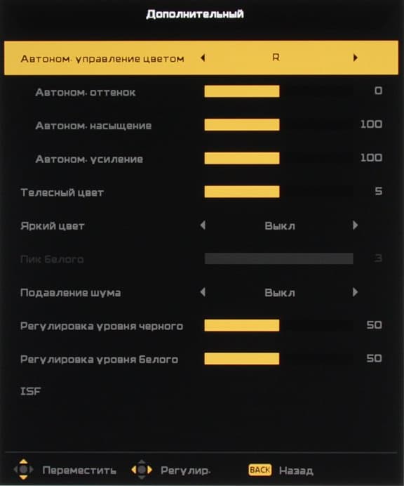 Режимов геометрической трансформации шесть. Первых четырех достаточно для вывода на экране 16:9 картинки с типичным или исходным соотношением сторон, еще один предназначен для выполнения необходимой трансформации в случае использования опциональной анаморфотной насадки (объектива), и последний подразумевает автоматический выбор трансформации. Отдельная настройка влияет на обрезку краев, она позволяет немного увеличить картинку так, что исходное изображение по периметру выходит за область проекции.