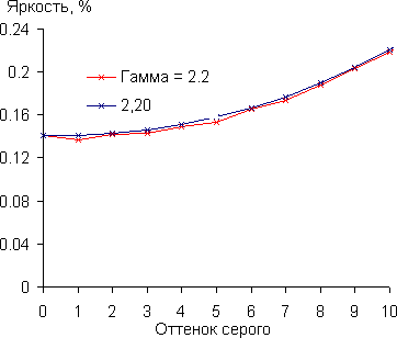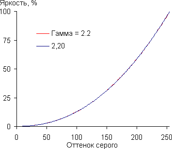 Реальная гамма-кривая аппроксимируется степенной функцией с показателем 2,20, что равно стандартному значению 2,2: