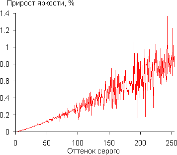График ниже показывает прирост (не абсолютное значение!) яркости между соседними полутонами, полученный при последовательном выводе 256 оттенков серого (от 0, 0, 0 до 255, 255, 255) в случае оптимального сочетания параметров (Гамма = 2.2):