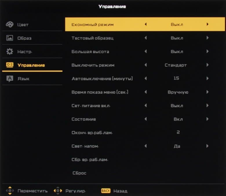 В меню выбирается тип проекции (фронтальная / на просвет, обычное / потолочное крепление). Проектор среднефокусный, а при максимальном фокусном расстоянии объектива скорее длиннофокусный, поэтому при фронтальном проецировании его лучше располагать примерно на линии первого ряда зрителей или за ней.