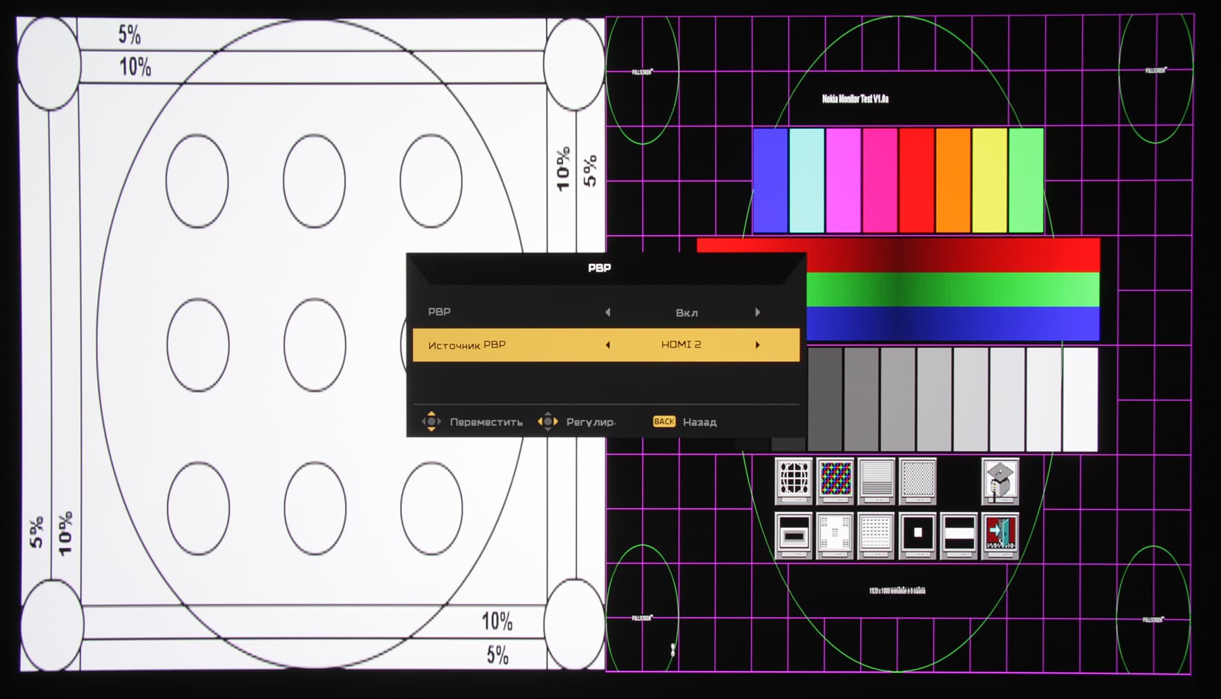 Присутствует функция двойного изображения картинка-в-картинке (PIP) и картинка-рядом-с-картинкой (PBP). В случае PBP экран делится на две равные области справа и слева и в каждой изображение выводится с заполнением всей области без сохранения исходных пропорций.