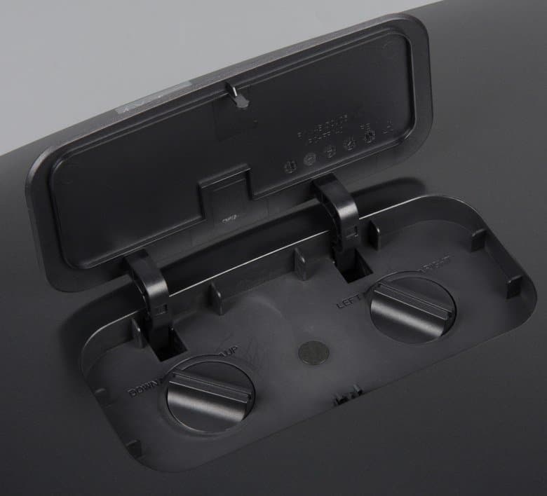 Два воротка за откидывающейся крышкой на верхней панели позволяют смещать границы проекции так, что картинка смещается максимум на 65% от высоты проекции вверх и вниз по вертикали и на 27% от ширины проекции вправо и влево по горизонтали.