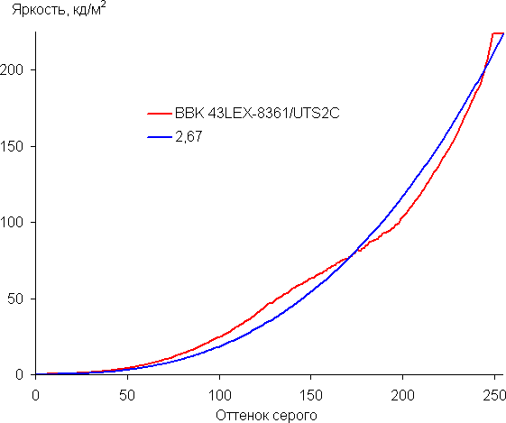 Аппроксимация полученной гамма-кривой дала показатель 2,67, что выше стандартного значения 2,2, но это не имеет значения, так как реальная гамма-кривая заметно отклоняется от аппроксимирующей степенной функции:
