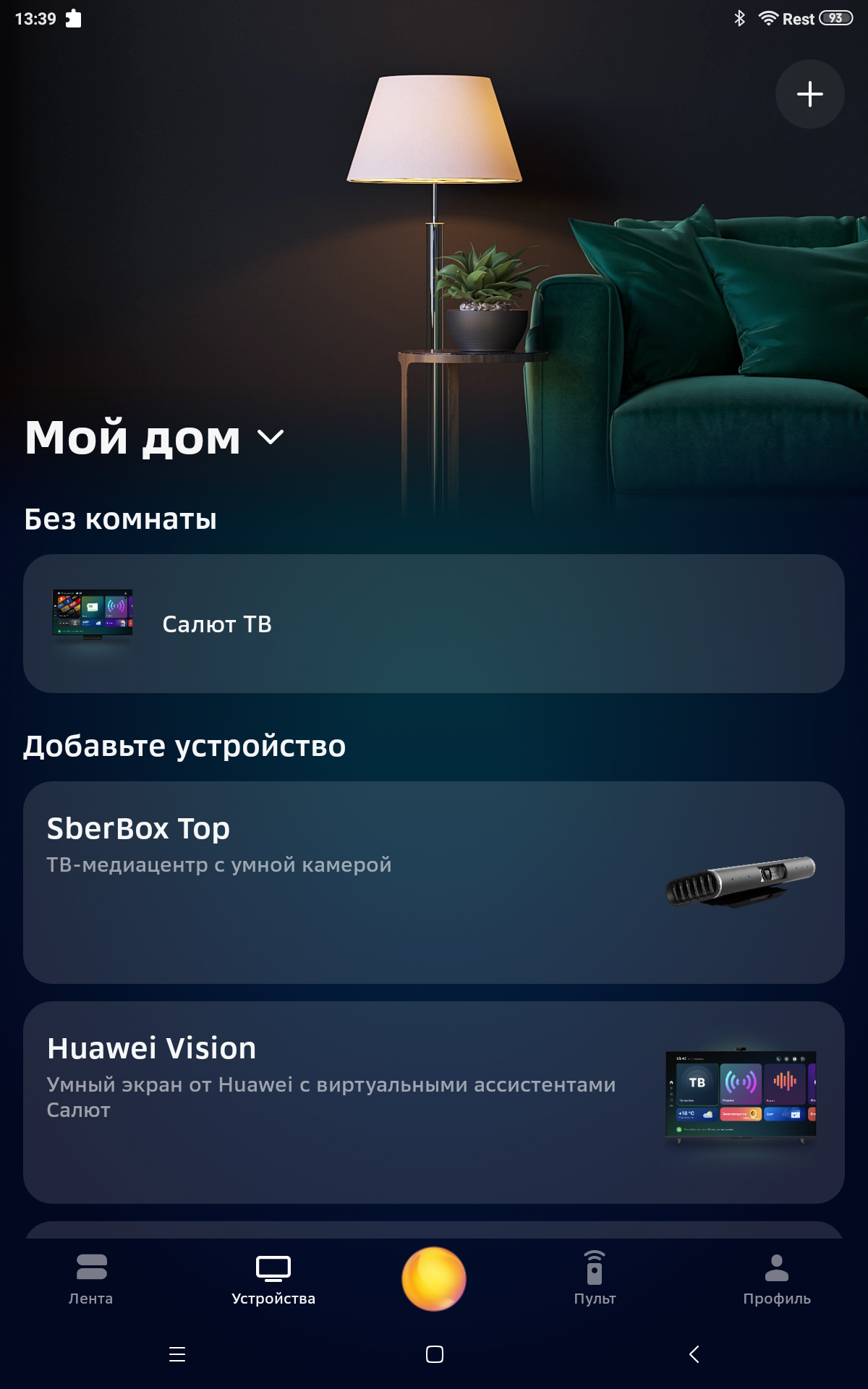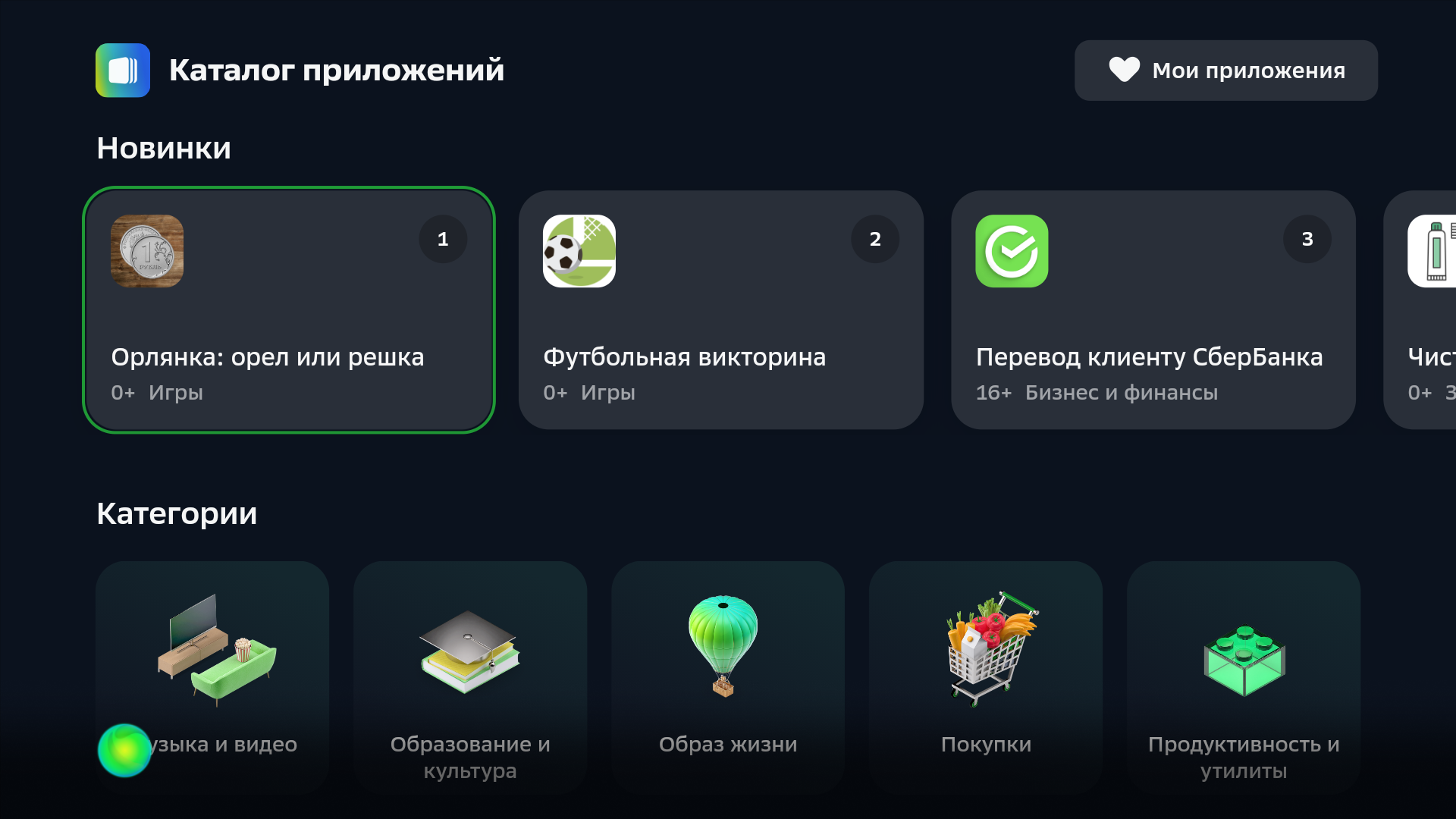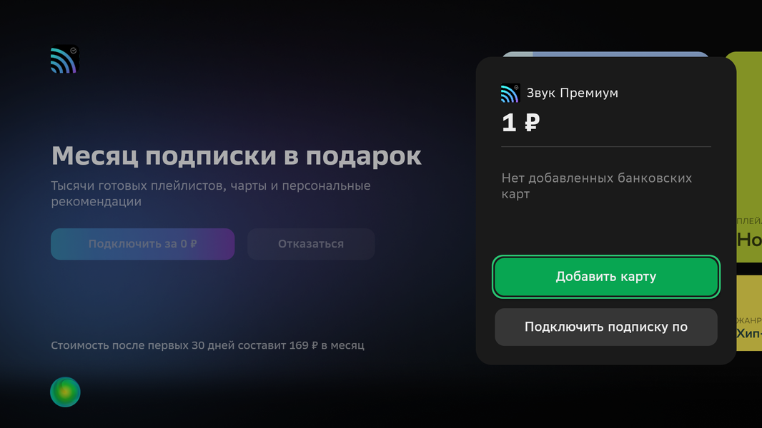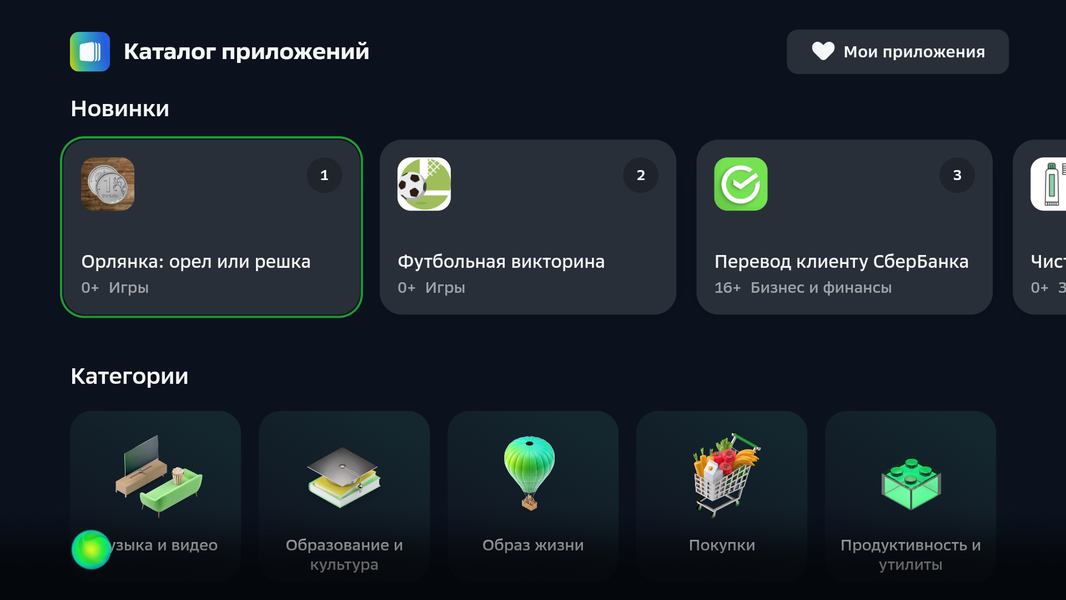 Салют ТВ Сбер называет операционной системой на базе Android (в данном случае версии 9). В принципе, этот телевизор можно использовать, не входя на нем в аккаунт Сбер ID, но тогда почти все сервисы, даже бесплатные, будут недоступны. Со Сбер ID можно установить программы из встроенного магазина, заказать доставку еды, поиграть в игры и т.д. Впрочем, даже со Сбер ID доступ к большинству сервисов будет возможен только на условиях платной подписки. Для ряда сервисов, например для СберЗвук, есть промопериоды бесплатного использования, но для их активации потребуется ввести данные карты.
