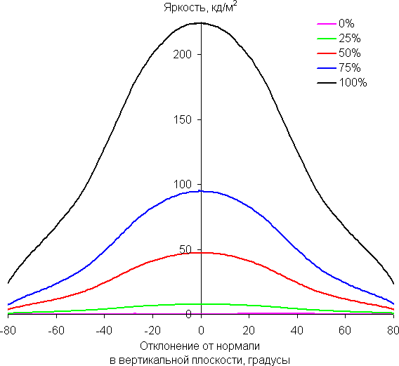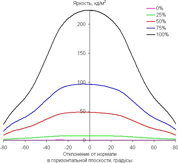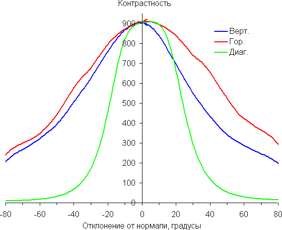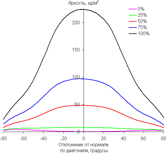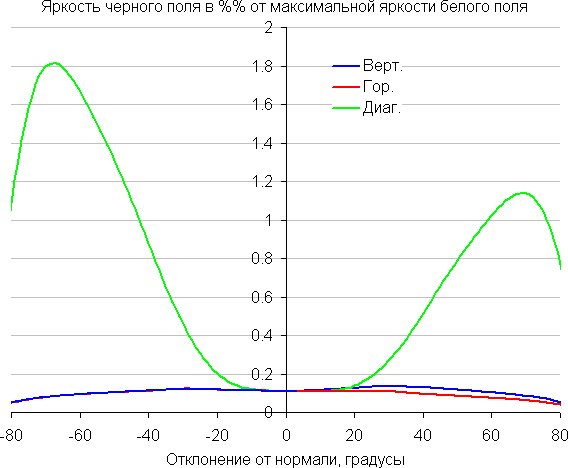 По скорости снижения яркости углы обзора хорошие. При отклонении в диагональном направлении яркость черного поля начинает резко возрастать уже при 20°-30° отклонения от перпендикуляра к экрану. Если сидеть не очень далеко от экрана, то черное поле по углам будет заметно светлее, чем в центре, но оставаться условно нейтрально-серым. Контрастность в диапазоне углов ±82° в случае отклонения по диагонали в одном направлении опускается ниже отметки 10:1 при −75°.