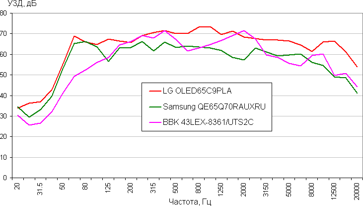 Громкость встроенной акустической системы для жилой комнаты, соответствующей по размерам данной диагонали экрана, достаточная. Стереофонический эффект распознается. Присутствуют высокие и средние частоты, низких — немного. Явно есть паразитные резонансы корпуса. В целом даже для класса встроенной в телевизор акустики ее качество среднее. Сравним АЧХ этого ТВ с АЧХ двух телевизоров высшего класса (получена с помощью шумомера при воспроизведении звукового файла с розовым шумом, интервал УЗД в 1/3 октавах):