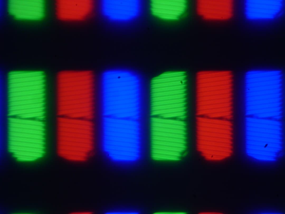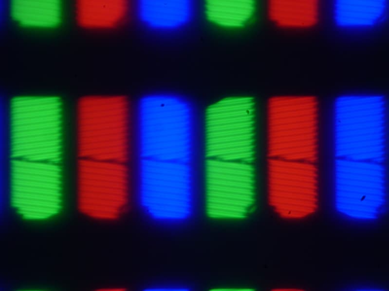 Субпиксели трех цветов (красного, зеленого и синего) поделены на две примерно равные по площади области с разной ориентацией доменов. Такое сложное устройство в принципе способно обеспечить хорошие углы обзора. Отметим, что никакого видимого «кристаллического эффекта» (микроскопической вариации яркости и оттенка) в данном случае нет.
