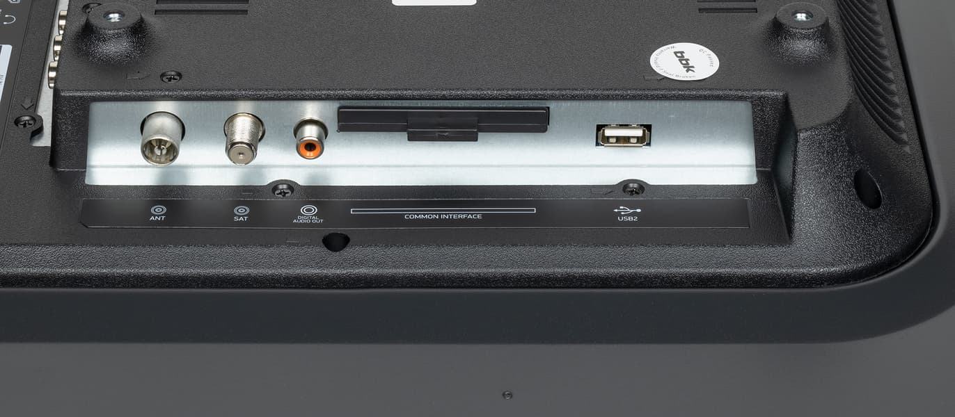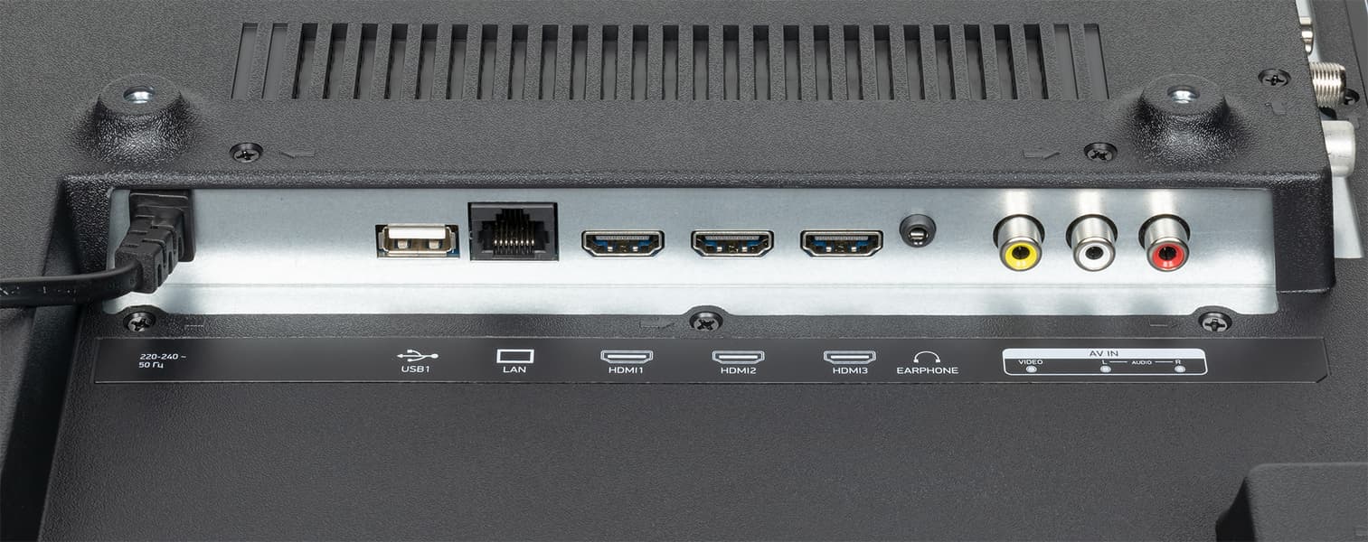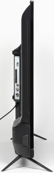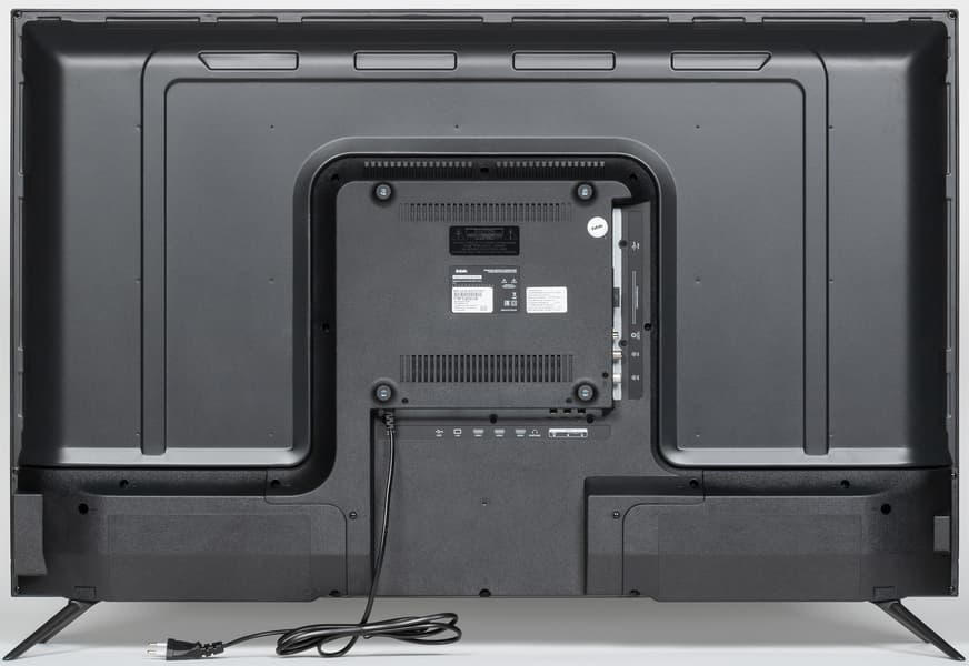 Задняя панель условно в верхней части изготовлена из тонкого листа стали и имеет стойкое черное матовое покрытие. Выступающий назад кожух в нижней части с заходом на нижний торец изготовлен из черного пластика с матовой поверхностью. Интерфейсные разъемы размещены на нижнем и левом торцах выступа сзади. Соответственно часть разъемов направлена вниз, часть вбок. Спереди дотягиваться до разъемов, даже направленных вбок, все равно неудобно, так как они далеко от края телевизора. Подключать кабели к разъемам, направленным вниз, еще сложнее, а там востребованные USB и выход на наушники. Телевизор даже в верхней части не тонкий.