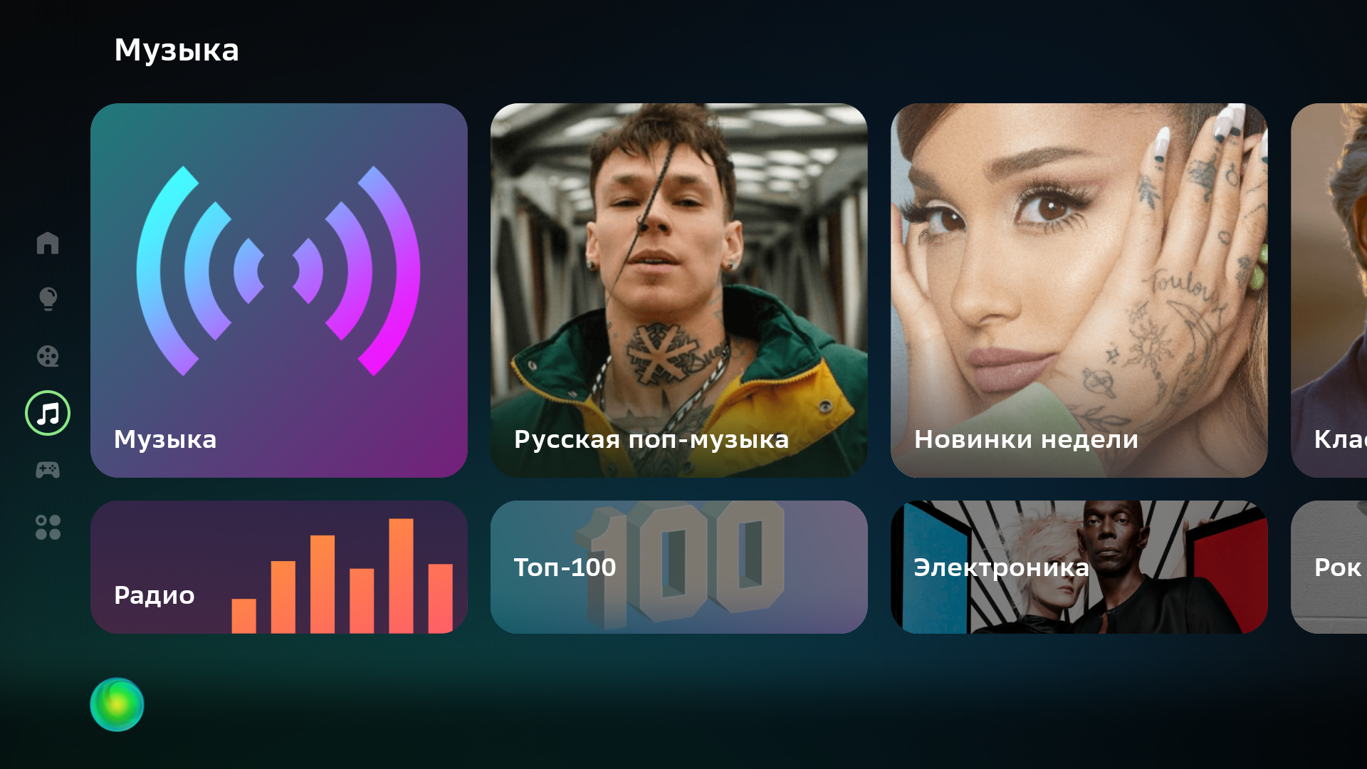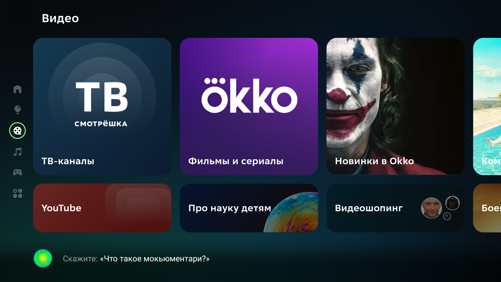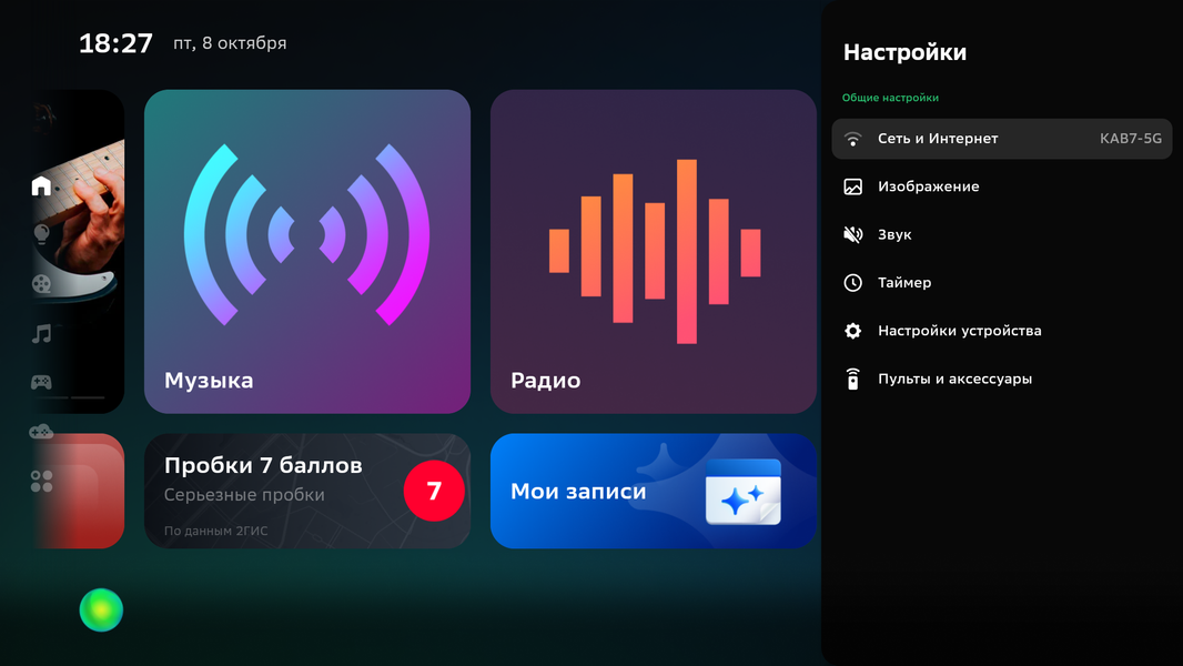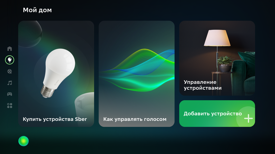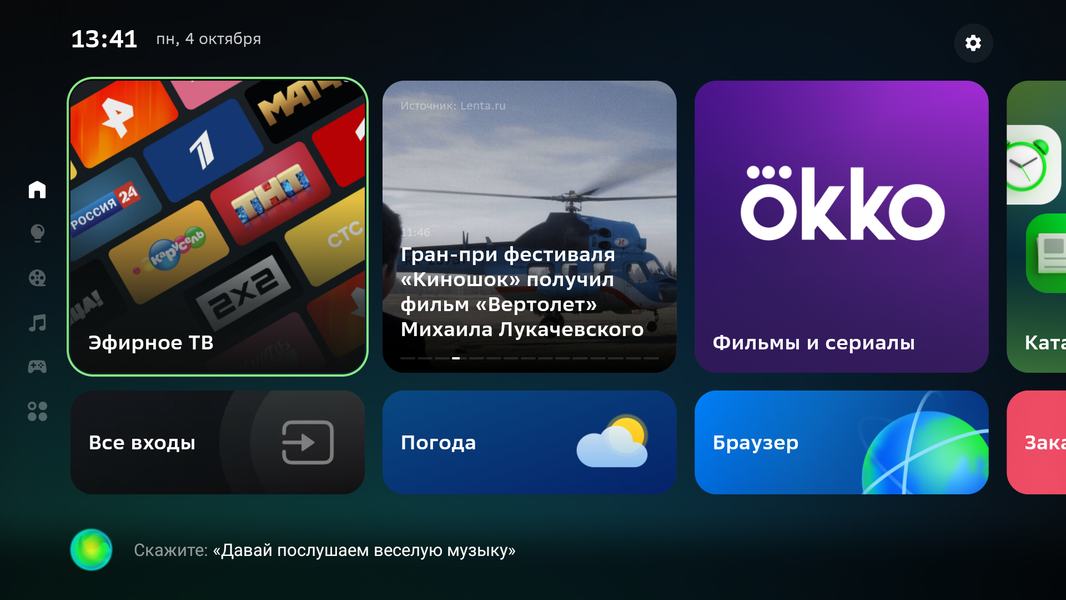 Домашняя страница Салют ТВ имеет простой дизайн — горизонтальные ленты плиток приложений и сервисов занимают большую часть экрана справа, слева находится вертикальный столбец с закладками категорий, а вверху справа притулилась шестеренка входа в меню с настройками.