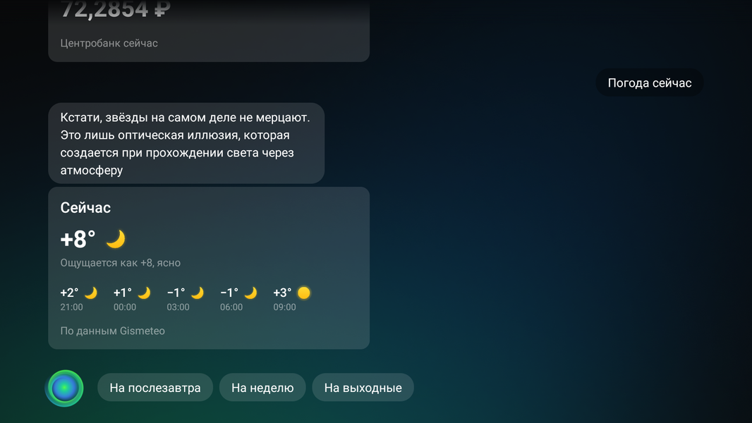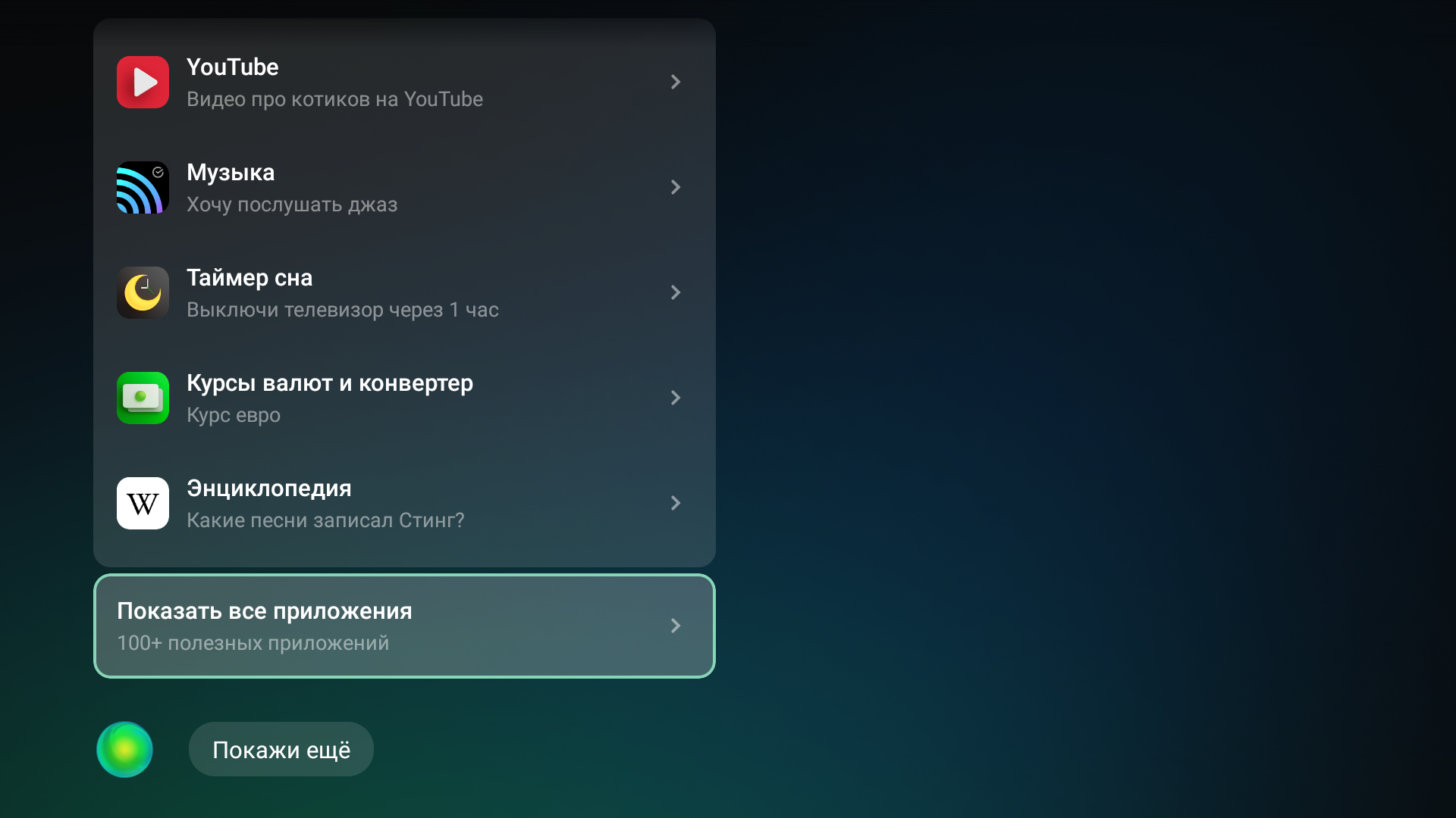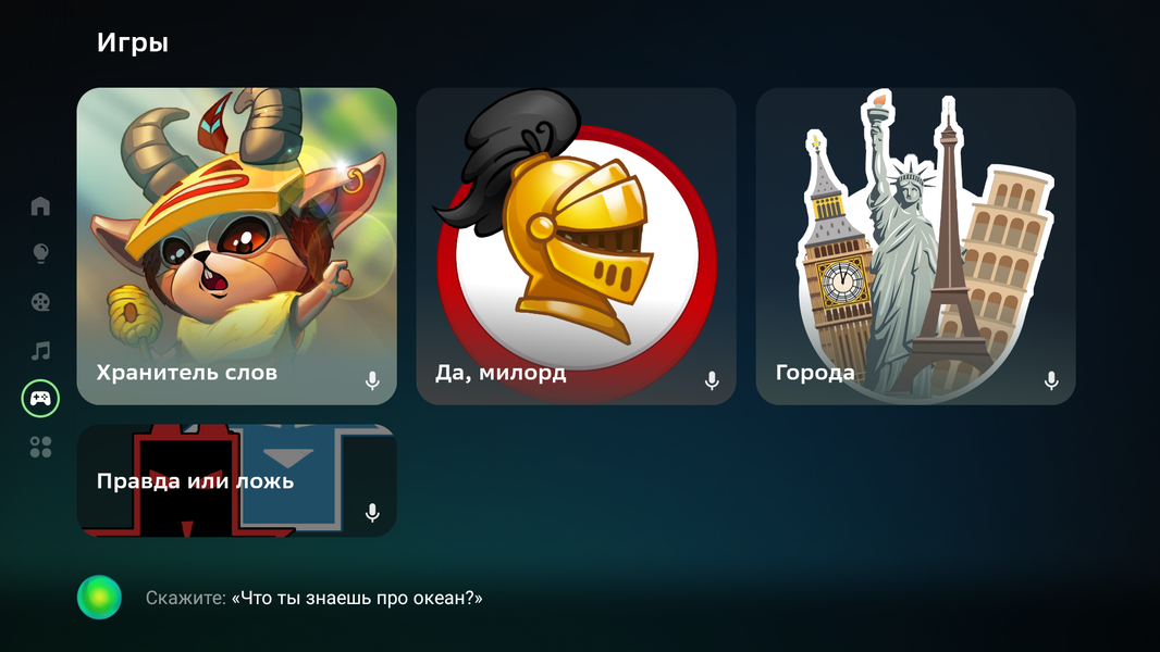Управление непосредственно самим ТВ с помощью ассистентов простое: мы смогли обнаружить, что голосом можно запускать нужное приложение, переключаться на ТВ-канал по его названию, включать/выключать звук и регулировать громкость (последние две функции и так доступны напрямую с кнопок пульта). Среди навыков есть установка таймера на выключение телевизора, но по факту это не работает.