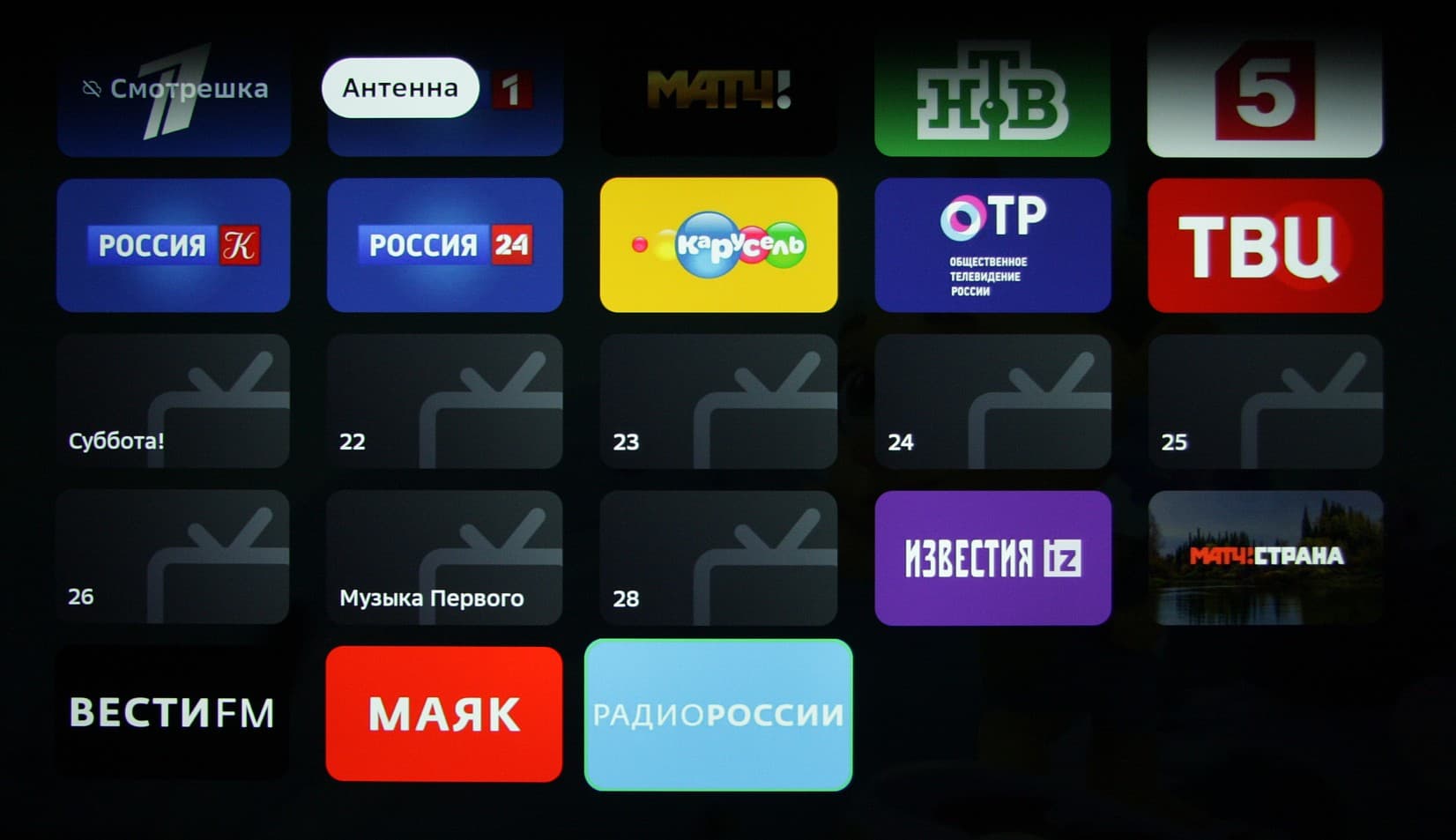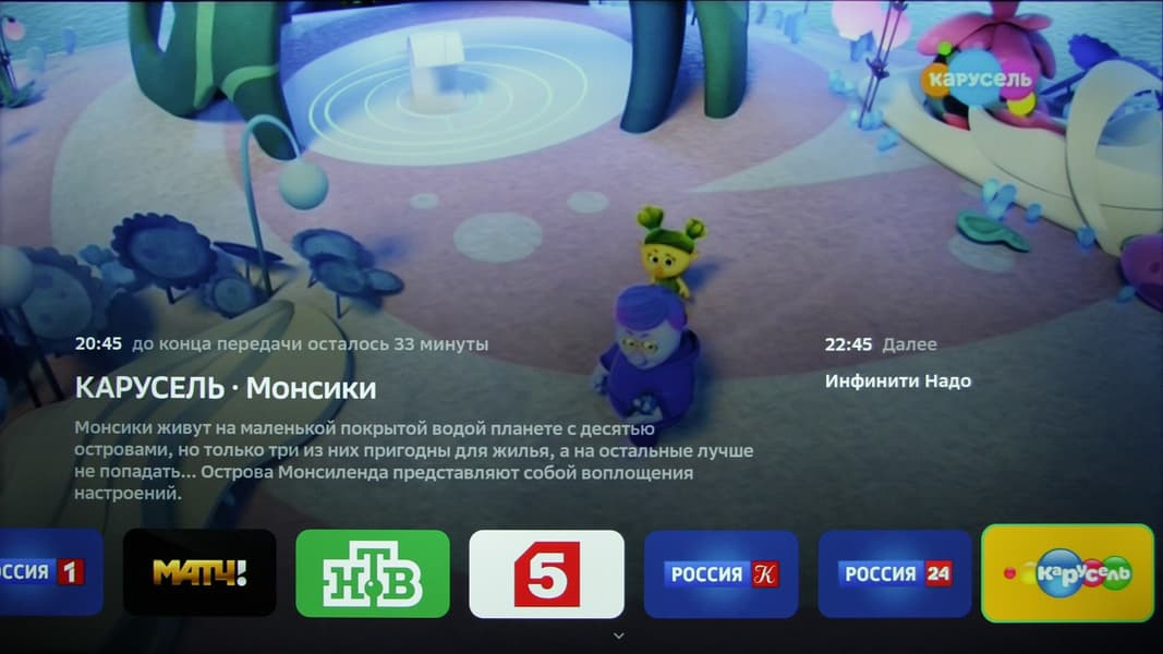 Под плиткой с названием Эфирное ТВ на заглавной странице спрятано два списка: каналы Смотрешки и каналы, действительно обнаруженные в эфире/кабеле. В телевизоре нет продвинутых функций для улучшения качества изображения. Есть очень ограниченная поддержка электронной программы передач — можно посмотреть описание текущей программы и название следующей.