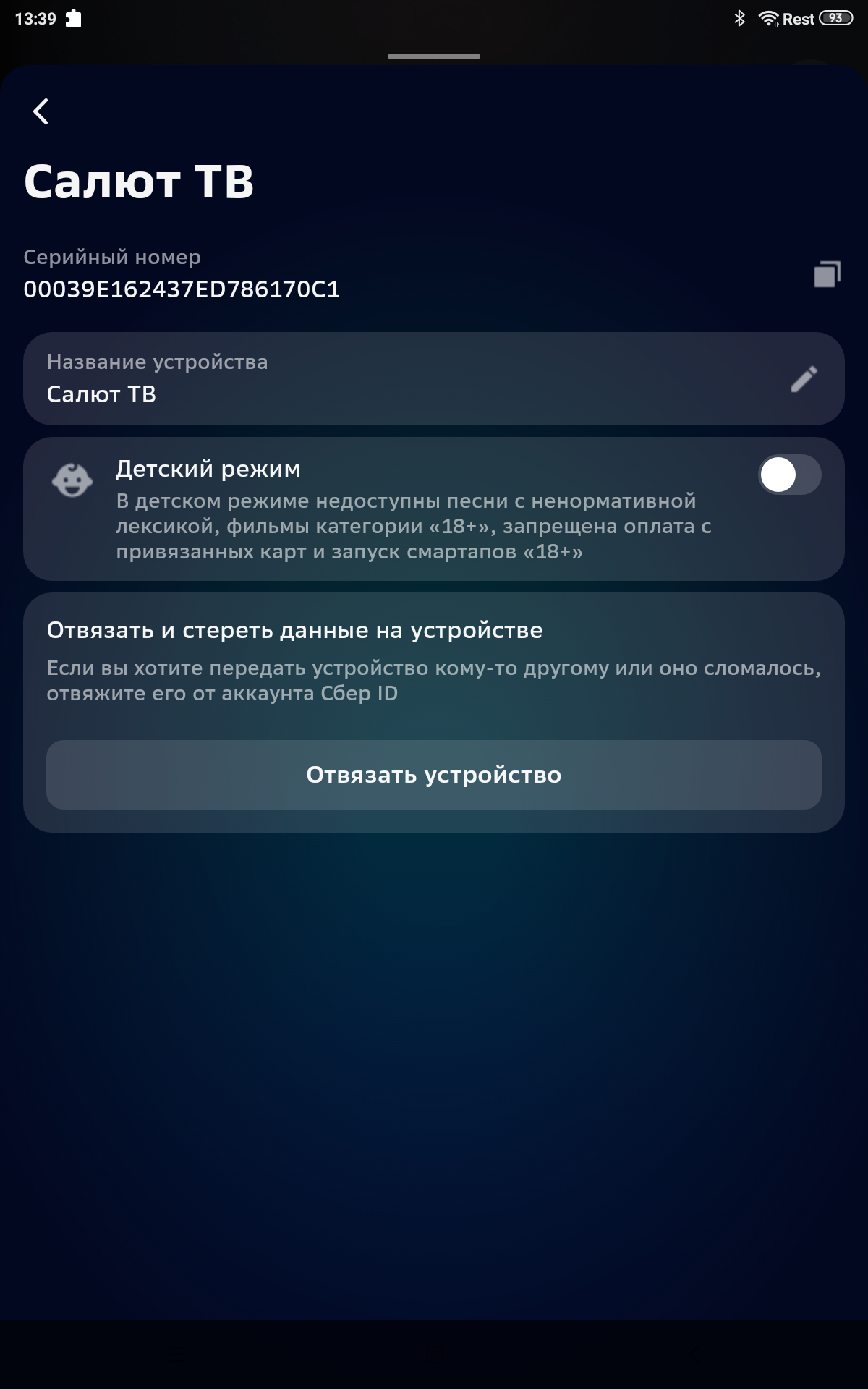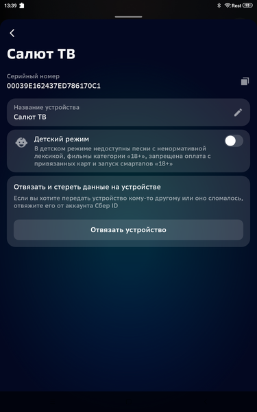 Также ТВ можно переименовать, включить на нем детский режим и отвязать устройство от аккаунта Сбер ID.