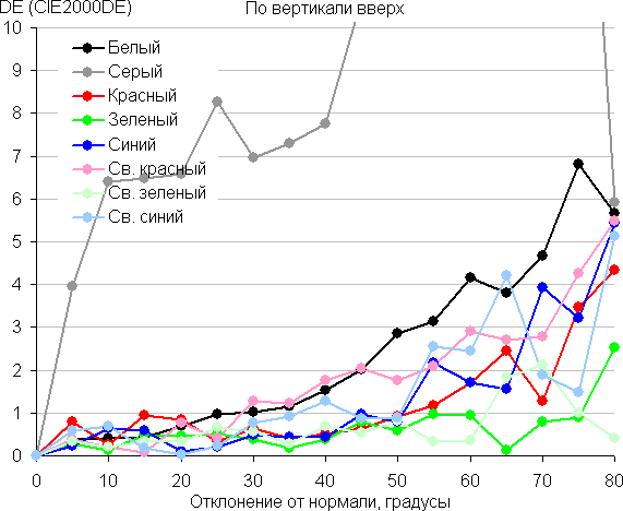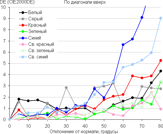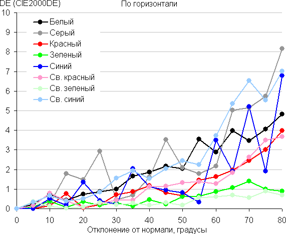 Для количественной характеристики изменения цветопередачи мы провели колориметрические измерения для белого, серого (127, 127, 127), красного, зеленого и синего, а также светло-красного, светло-зеленого и светло-синего полей во весь экран с использованием установки, подобной той, что применялась в предыдущем тесте. Измерения проводились в диапазоне углов от 0° (датчик направлен перпендикулярно к экрану) до 80° с шагом в 5°. Полученные значения интенсивностей были пересчитаны в отклонение ΔE относительно замера каждого поля при перпендикулярном положении датчика относительно экрана. Результаты представлены ниже: