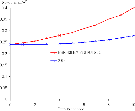По всей видимости, в этом ТВ есть не отключаемая динамическая подстройка яркости полутонов, что и приводит к искажению гамма-кривой, полученной при последовательном выводе оттенков во весь экран.