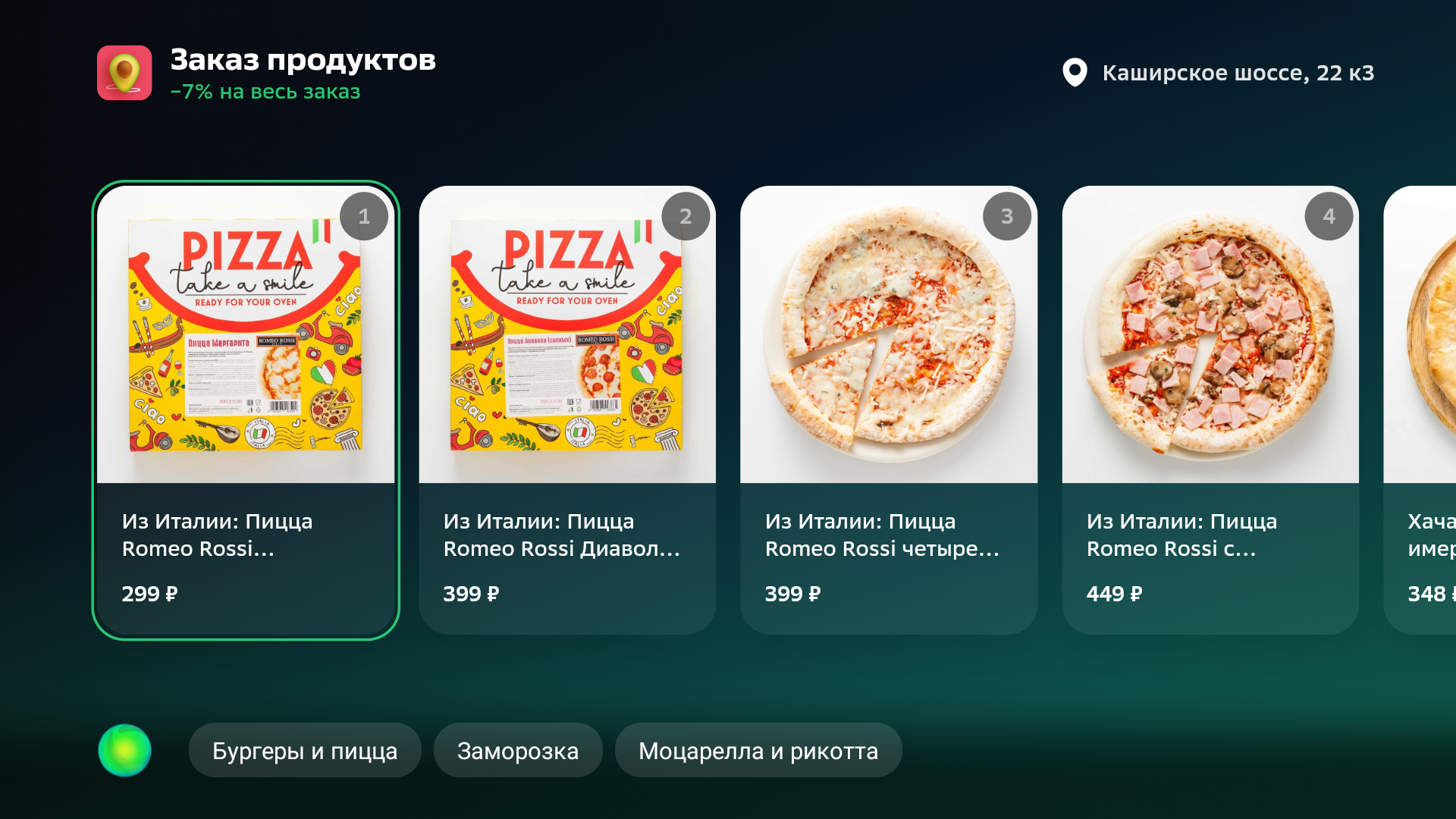 Возможности что-либо изменить на заглавной странице нет. Из сервисов самым востребованным явно будет заказ еды на дом. Еду можно выбирать из каталога или с помощью голосового помощника, сказав, например, «Хочу пиццу».