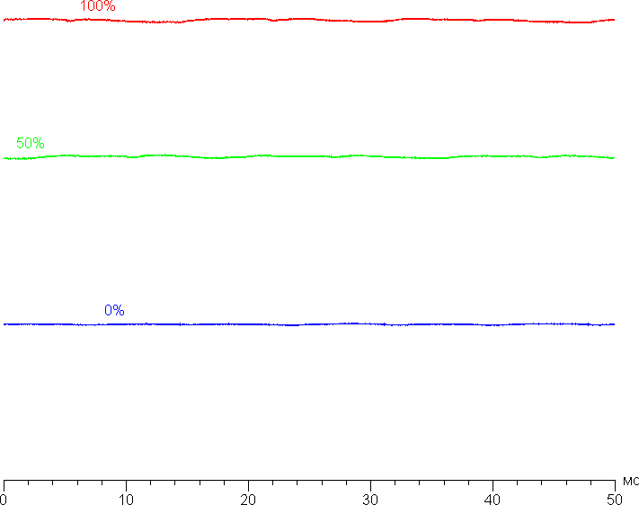 На любом уровне яркости значимая модуляция подсветки отсутствует, поэтому нет и никакого мерцания экрана. В доказательство приведем графики зависимости яркости (вертикальная ось) от времени (горизонтальная ось) при различных значениях настройки Подсветка: