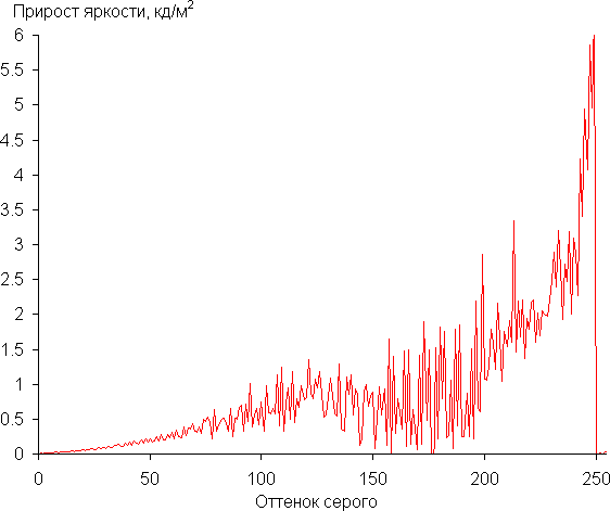 Для оценки характера роста яркости на шкале серого мы измерили яркость 256 оттенков серого (от 0, 0, 0 до 255, 255, 255). Делали мы это при Контраст = 54 и Яркость = 49, чтобы минимизировать завал в тенях и в светах. График ниже показывает прирост (не абсолютное значение!) яркости между соседними полутонами: