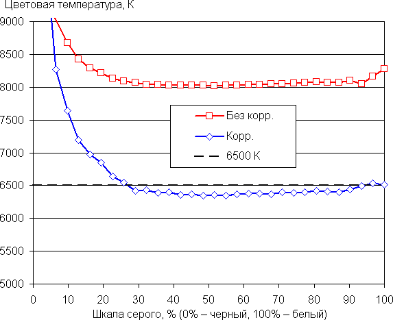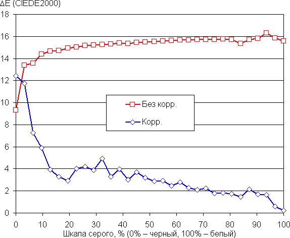 Самый близкий к черному диапазон можно не учитывать, так как в нем цветопередача не так важна, а погрешность измерения цветовых характеристик высокая. Ручная коррекция снизила ΔE до приемлемой величины и приблизила цветовую температуру к стандартным 6500 К, при этом оба параметра мало изменяется от оттенка к оттенку на значимой части шкалы серого — это положительно сказывается на визуальной оценке цветового баланса. Однако такая коррекция снизила максимальную яркость до 150 кд/м², соответственно снизилась и контрастность.