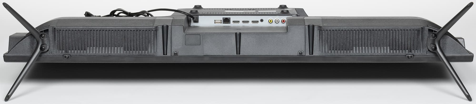 Штатная подставка состоит из двух отлитых из алюминиевого сплава ножек галочкой с матовым черным относительно стойким покрытием, которые винтами прикрепляются к нижнему торцу. Опираются ножки на противоскользящие накладки из упругого пластика. Жесткость конструкции соответствует весу телевизора. Телевизор стоит устойчиво, без видимого наклона. Расстояние между крайними точками ножек 946 мм.