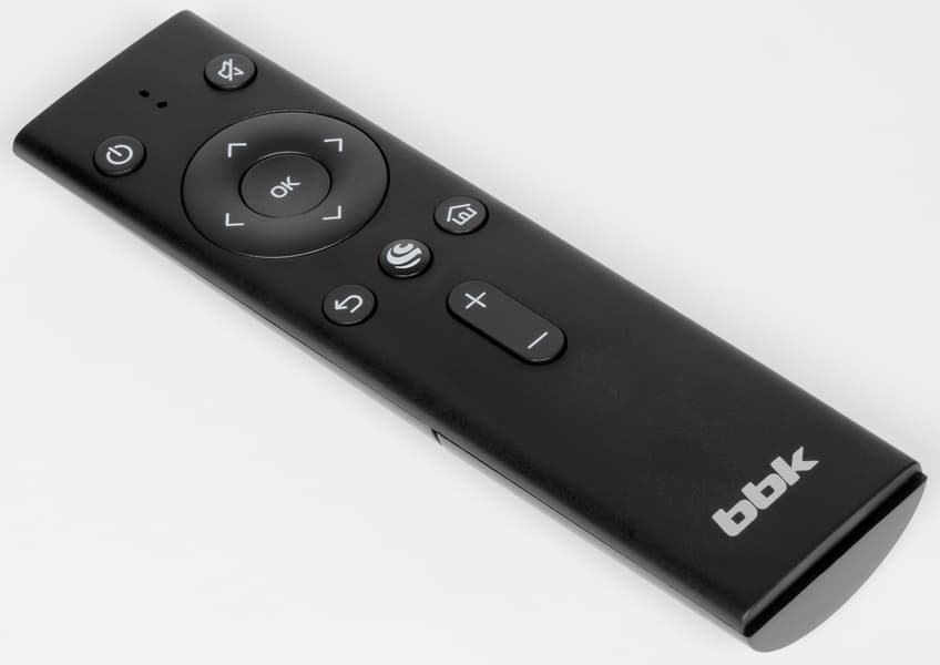 Корпус и кнопки пульта изготовлены из черного пластика с матовой поверхностью. Обозначения кнопок достаточно контрастные и крупные. Самих кнопок мало, но организация интерфейса и не очень богатая функциональная оснащенность не дают особого повода сожалеть об отсутствии дополнительных кнопок. Пульт гибридный, он может работать как по ИК, так и по Bluetooth. Индикатор в передней части пульта мигает красным в первом случае. По ИК пульт работает до сопряжения с телевизором и тогда, когда телевизор находится в режиме ожидания (но в этом режиме команды также передаются и по Bluetooth, что позволяет включать ТВ, не направляя на него пульт). Во всех остальных случаях ИК-передатчик не работает, и команды передаются только по Bluetooth. В передней части пульта рядом с индикатором есть отверстие микрофона.
