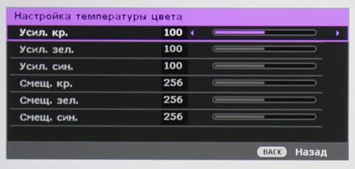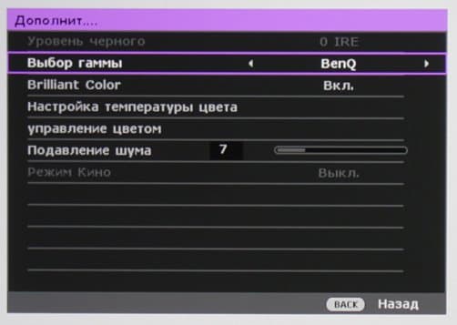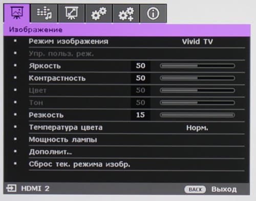Если не указано обратное, то выбран профиль без коррекции цветовой температуры, включен режим Brilliant Color, включен режим высокой яркости лампы и объектив установлен на минимальное фокусное расстояние: