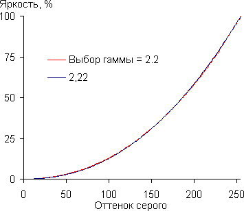 Впрочем, этот незначительный завал в тенях практически не сказывается на картинке. Аппроксимация полученной по 256 точкам гамма-кривой дала значение показателя 2,22, при этом аппроксимирующая функция совпала с реальной гамма-кривой: