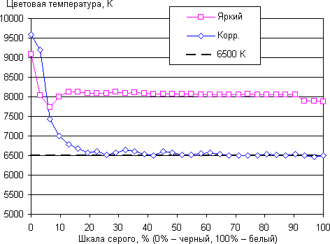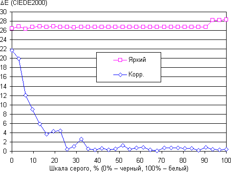 Графики ниже показывают цветовую температуру на различных участках шкалы серого и отклонение от спектра абсолютно черного тела (параметр ΔE) для самого яркого режима (при включенном Brilliant Color) и после ручной коррекции цветопередачи. Укажем, что близкий к черному диапазон можно не учитывать, так как в нем цветопередача не так важна, а погрешность измерения цветовых характеристик высокая.
