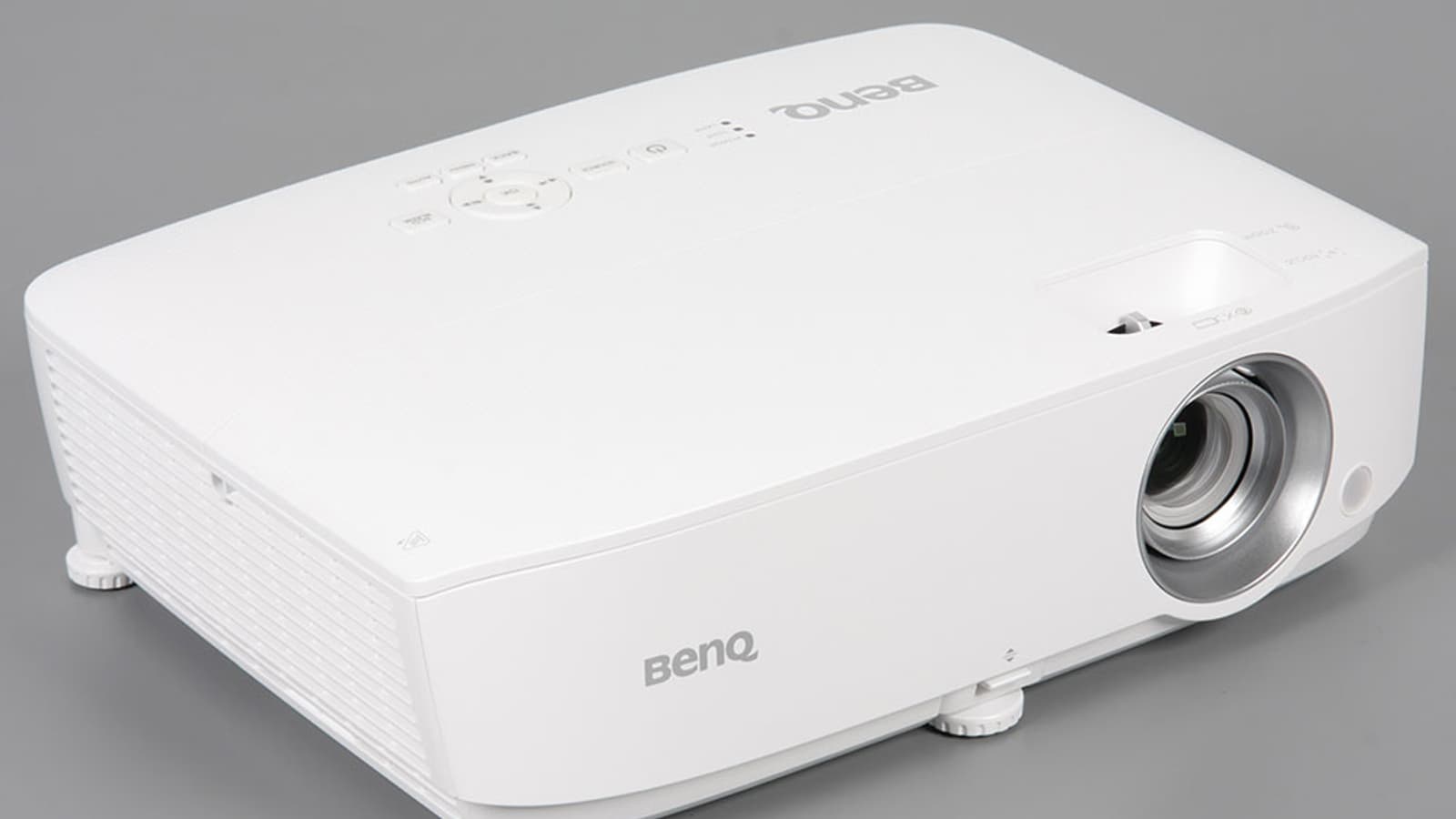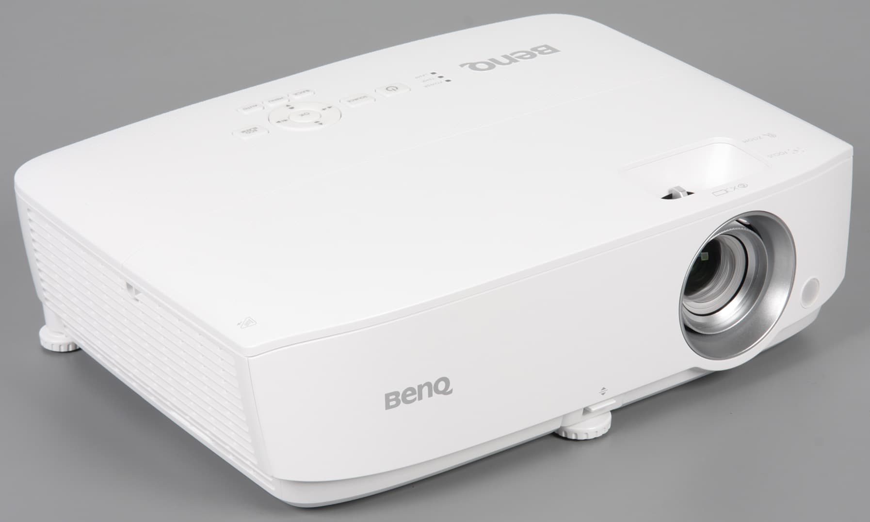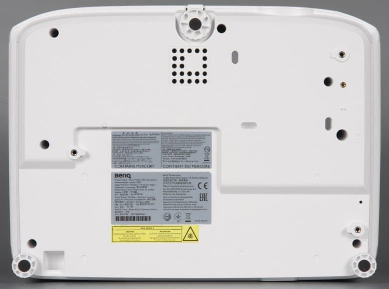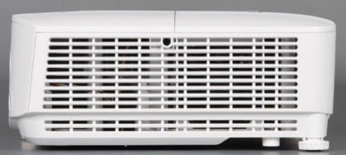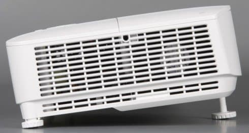 На дно этой ниши наклеен лист прочного пластика — металлические края разъемов видимых царапин на нем не оставляют. Подписи к разъемам более-менее читаемые. Также на задней панели можно обнаружить разъем питания и разъем для кенсингтонского замка. На стыке днища и задней панели есть скоба из пластика, за которую проектор можно пристегнуть к чему-то массивному, чтобы не украли. Заборная решетка вентиляции находится на левом боку. Фильтра от пыли в проекторе нет, что, впрочем, типично для современных DLP-проекторов.