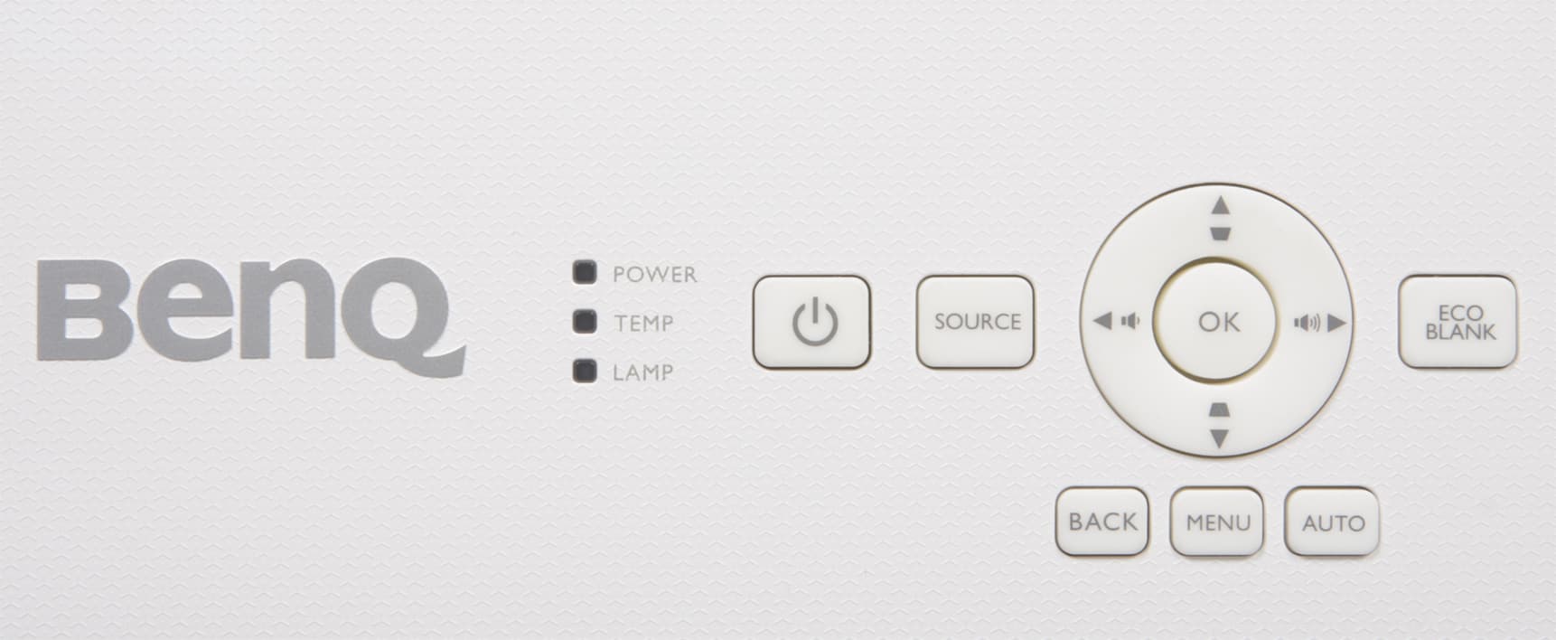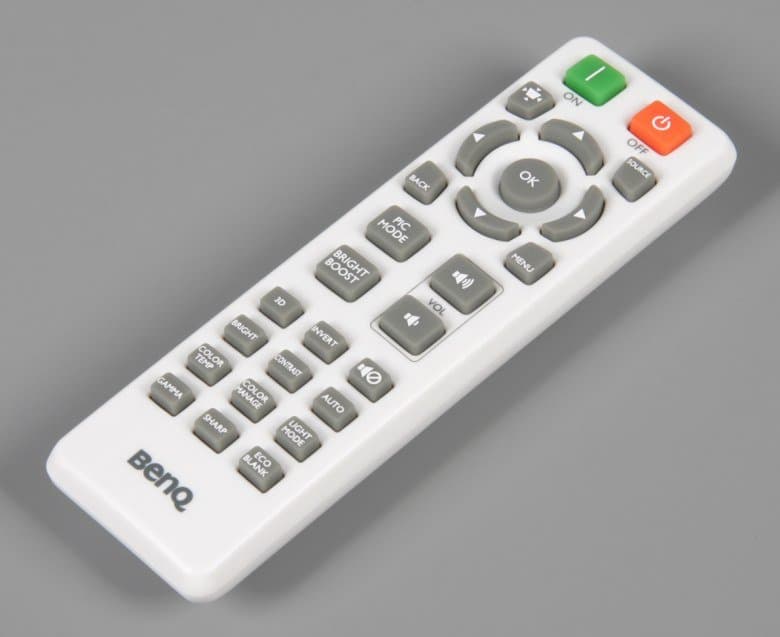 Корпус пульта изготовлен из белого пластика с матовой и поверхностью. Благодаря небольшим размерам пульт удобно лежит в руке. Кнопки изготовлены из упругого резиноподобного пластика, их относительно много, они мелкие, как и надписи на них, поэтому пользоваться пультом не очень удобно. Подсветки кнопок, к сожалению, нет. Включение и выключение проектора разнесены на две разные кнопки, но подтверждение на выключение все-таки запрашивается.