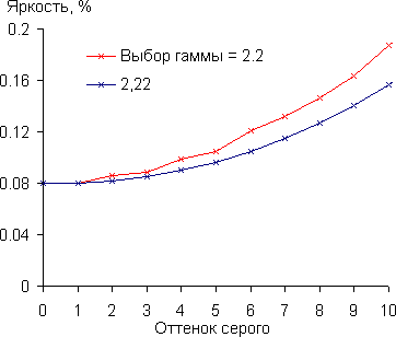 Настройка гамма-коррекции произведена точно, фактический показатель практически равен значению настройки.