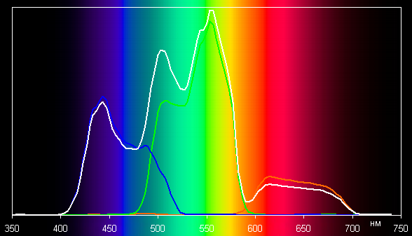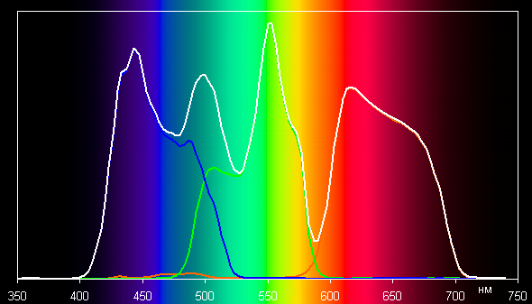 В итоге цвета имеют естественную насыщенность (напомним, что практически весь потребительский цифровой контент рассчитан на демонстрацию на устройствах с охватом sRGB). Ниже приведены спектры белого поля (белая линия), наложенные на спектры красного, зеленого и синего полей (линии соответствующих цветов) при включенном Brilliant Color с выбором самого яркого встроенного профиля: