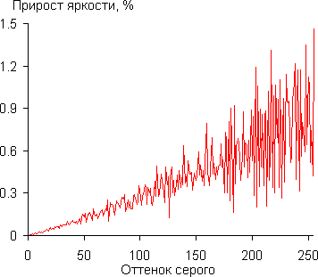 Для оценки характера роста яркости на шкале серого мы измерили яркость 256 оттенков серого (от 0, 0, 0 до 255, 255, 255) при Выбор гаммы = 2.2. График ниже показывает прирост (не абсолютное значение!) яркости между соседними полутонами: