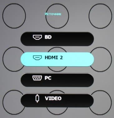 Есть отключаемая функция автоматического поиска активного подключения. Вручную видеовходы перебираются кнопкой с подписью Source на корпусе или на пульте ДУ (при этом на экран выводится список входов).