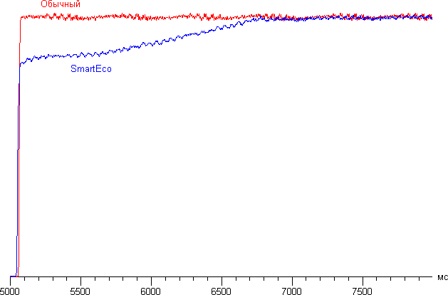 Контрастность без коррекции цветов достаточно высокая. Независимо от режима и значения прочих настроек через некоторое время вывода черного поля яркость лампы начинает снижаться, что формально повышает величину контрастности full on/full off. Ниже приведены графики изменения яркости (вертикальная ось) при переключении с черного поля на белое после 5 секунд проекции черного поля для режима SmartEco и для режима с максимальной яркостью лампы. Для наглядности графики сглажены: