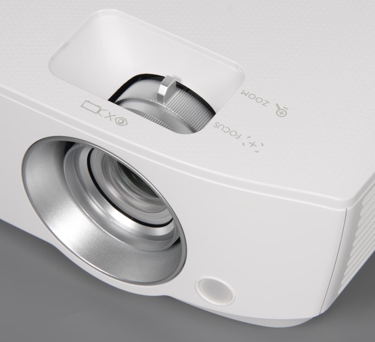Фокусировка изображения на экране и регулировка фокусного расстояния осуществляются вращением ребристых колец на объективе, кольцо для второй регулировки снабжено небольшим выступом-воротком. Положение объектива относительно матриц настроено так, что нижний край изображения находится немного выше оси объектива. Есть функция ручной цифровой коррекции вертикальных трапецеидальных искажений. При настройке проекции из меню на экран можно вывести простую таблицу в виде белой сетки на черном фоне.