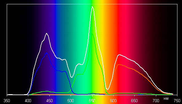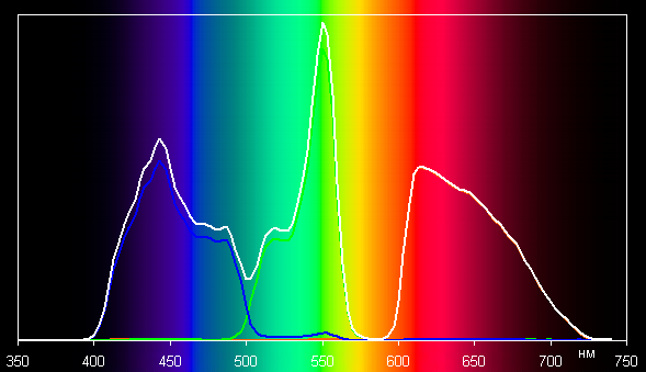 Ниже приведены спектры для белого поля (белая линия), наложенные на спектры красного, зеленого и синего полей (линии соответствующих цветов) для профилей D. Cinema и Cinema: