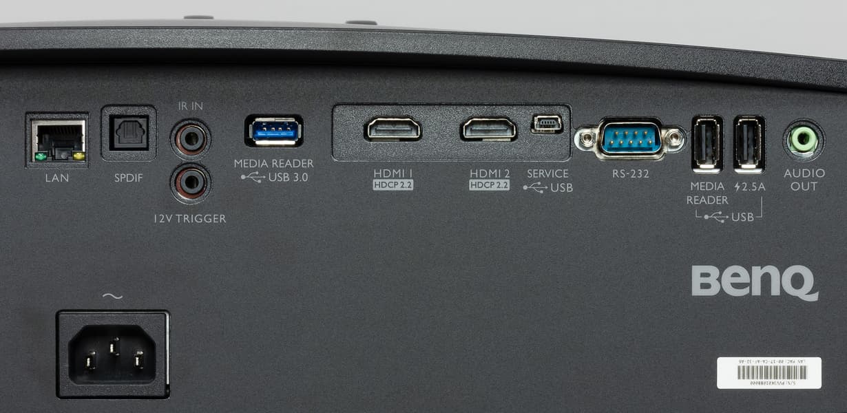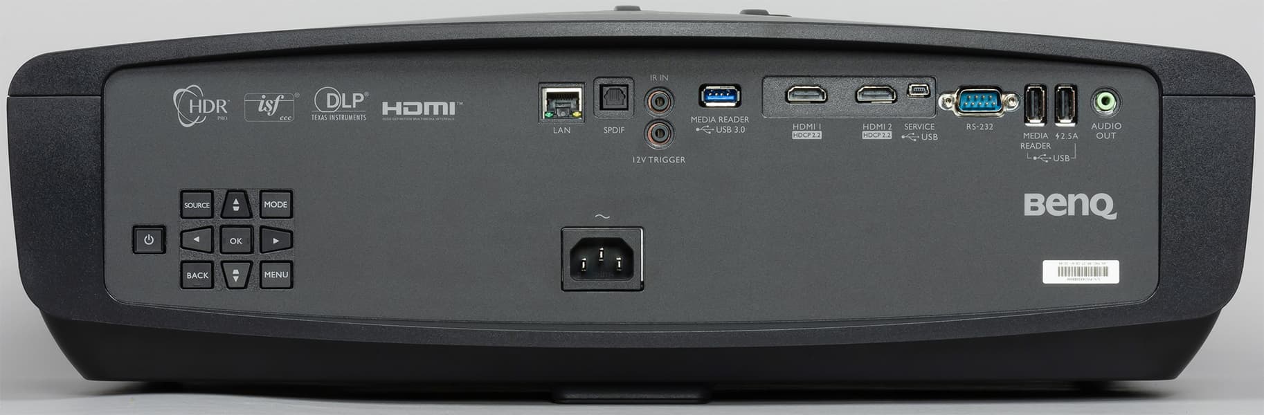 Проектор оснащен двумя HDMI-входами версии 2.0b и поддержкой HDCP 2.2. С практической точки зрения это означает, что они поддерживают не просто видеосигнал с разрешением 4К, но и с максимально возможной цветовой четкостью при частоте 60 кадр/с с метаданными HDR10 и HLG. Аналоговых входов нет, что в данном случае вполне допустимо. Переключение между источниками осуществляется с помощью кнопки Source на корпусе проектора или на пульте (при этом на экран выводится список входов, в котором выбирается нужный вход, а активные источники отмечены зеленой точкой). Есть отключаемая функция автоматического поиска активного входа. Заявлено, что проектор может взаимодействовать по протоколу CEC с подключенным оборудованием по HDMI — совместное включение/выключение. Но далеко не все производители допускают для своих устройств подобное взаимодействие, чаще под видом собственных протоколов вводятся искусственные ограничения. Входы HDMI способны принимать звук в цифровом виде. Также источником звука может служить встроенный мультимедийный плеер. Для подключения внешней аудиосистемы можно использовать аналоговый выход или цифровой оптический. USB-порты работают с USB-концентраторами, к которым одновременно можно подключать устройства ввода (HID, то есть, например, мышь и клавиатуру), а также накопители, включая внешние жесткие диски. Один порт USB, вроде бы, отличается повышенной нагрузочной способностью, а в остальном он такой же, как и соседний.